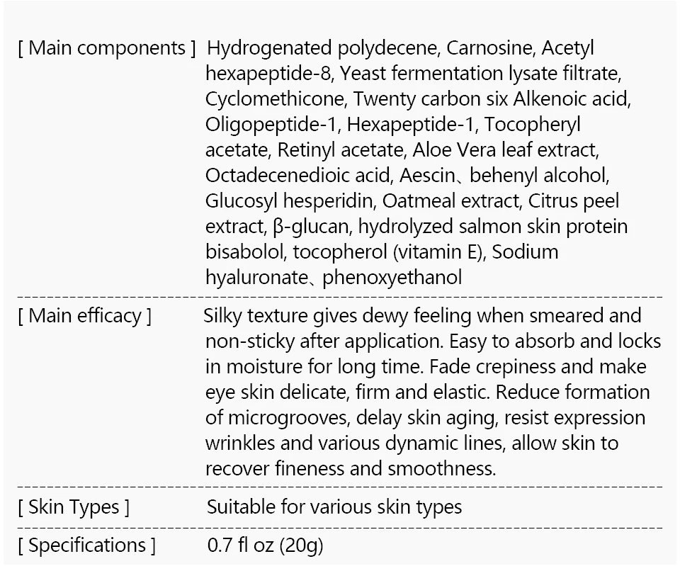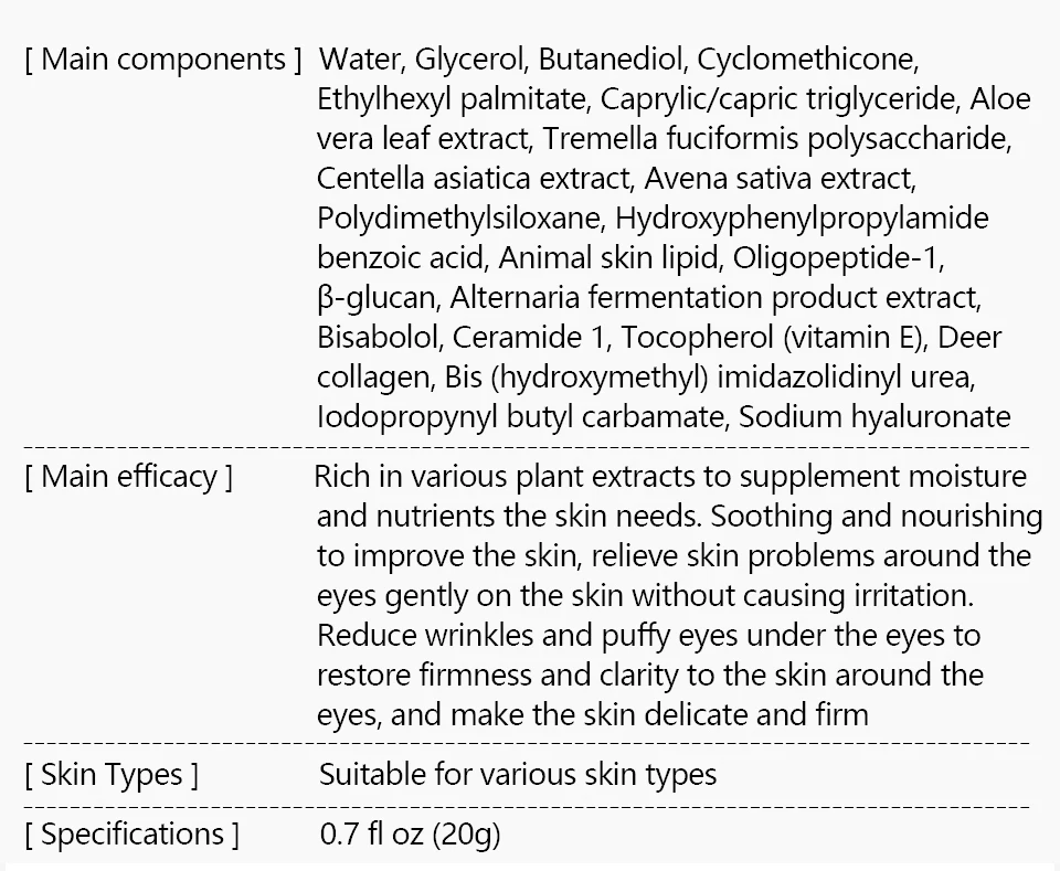 [Основные компоненты] вода, глицерин, бутандиол, циклометикон, этилгексил пальмитат, каприлик/каприк триглицерид, экстракт листьев алоэверы, тремелла фуциформис полисахарид, Экстракт центеллы азиатской, экстракт Авены сативы, Polydimethylsiloxane, hydroxyphenylpropylamidebenzoic кислота, липид кожи животных, Oligopeptide-1, глюкан, ферментация альтернарии экстракт продукта, бисаболол, керамид 1, токоферол (витамин), деерколлаген, бис (гидроксиметил) ureкарбамат, lodopropynyl бутилкарбамат, гиалуронат натрия [Основная эффективность] богатый различными растительными экстрактами, чтобы добавить влагу и питательные вещества, необходимые коже. Успокаивает и питает для улучшения кожи, снимает проблемы с кожей вокруг глаз мягко на коже, не вызывая раздражения. Уменьшает морщины и пухленькие глаза под глазами упругость и ясность кожи вокруг глаз, делает кожу нежной и упругой Типы кожи: подходит для различных типов кожи Спецификации: флакон 0,7 унций (20 г)