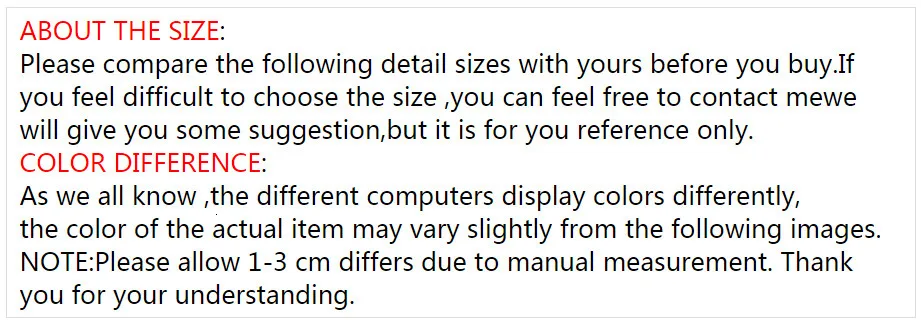 Сравните следующие деталиРазмеры с вашими перед вамиY. Если вам сложно выбрать размер, вы можете связаться с нами, мы дадим вам некоторые рекомендацииTiНа, но это только для справки.