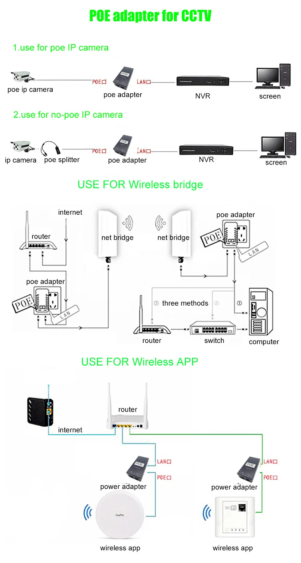 Настенный адаптер для инжектора POE Ethernet, адаптер питания для ip-камеры, вилка стандарта США/ЕС/Великобритании Идеальное решение для приложений, где электрическая розетка может быть недоступна, адаптер инжектора может использоваться для питания устройств с поддержкой PoE, таких как ip-камеры или беспроводные точки доступа (точки доступа). Компактная конструкция с настенным креплением позволяет легко установить адаптер в области, где пространство ограничено, и его можно установить за считанные секунды без какой-либо настройки.