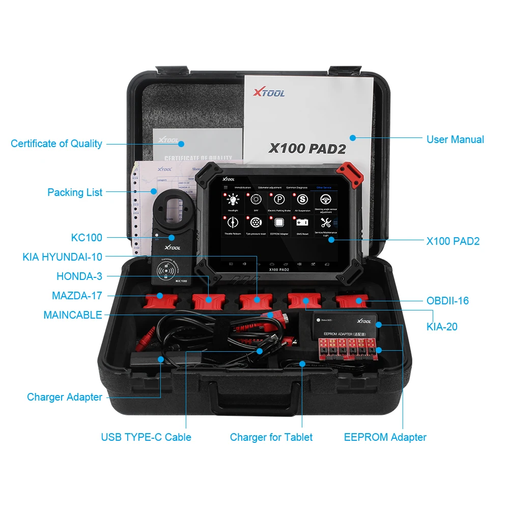 X100 PAD2 Pro-замечательный программист для ключей планшета! Он не только предоставляет клиентам профессиональные ключевые программирование, но и наиболее необходимые специальные функции для мастерской. X-100 PAD2-это планшет с новейшими технологиями для выполнения ключевых программ, регулировки пробега, сброса масляного сервиса, сброса ремня времени, сброса сервисного светильник, сброса давления в шинах, сброса, сброса EPB, сброс дроссельной заслонки, сброс ДПФ, сброс батареи, Калибровка угла рулевого управления и OBD-II Диагностика двигателя, И особенно добавляется с VW 4th и 5th IMMO.