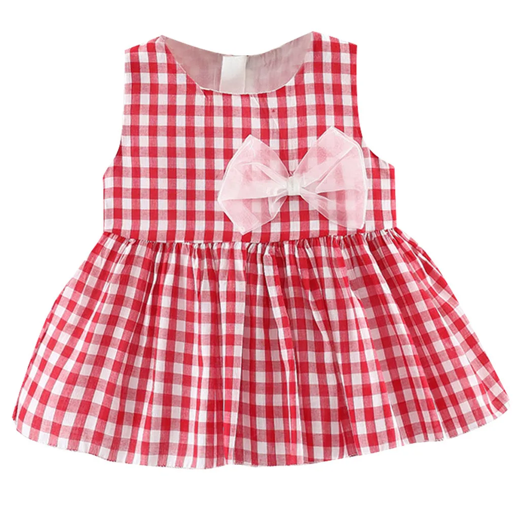 Baby Girl Kids Casual Summer Sleeveless O-neck Bow Plaid Princess Dress