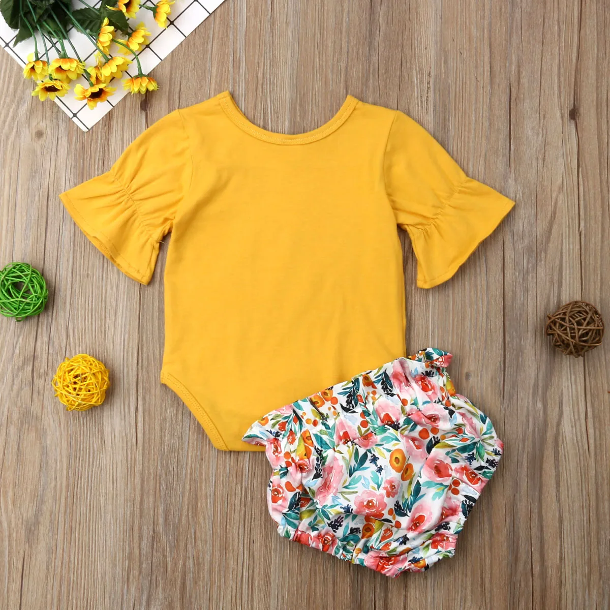 Комплект из 2 предметов для новорожденных девочек 3-18 месяцев, комбинезон с цветочным принтом, желтый летний топ + штаны, комбинезон, комплект одежды, пляжный костюм!