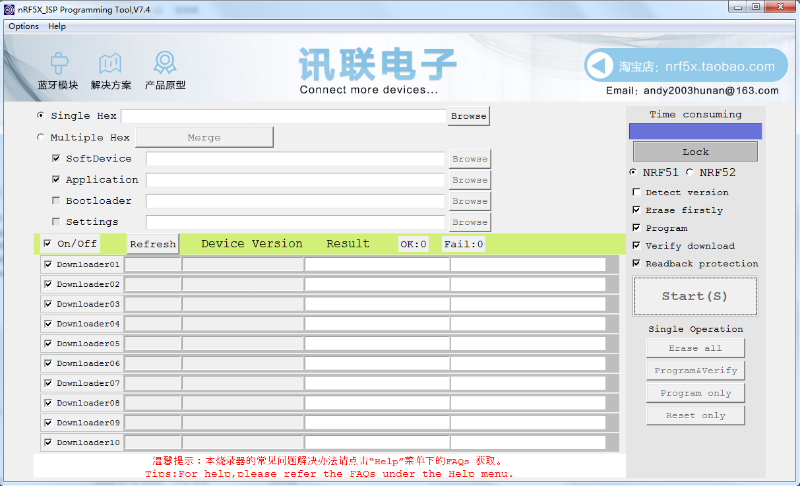 免费赠送讯联电子自主研发的 NRF-ISP 烧录软件,NRF5X 全系列芯片都可烧录, 最新支持settings的烧录 。