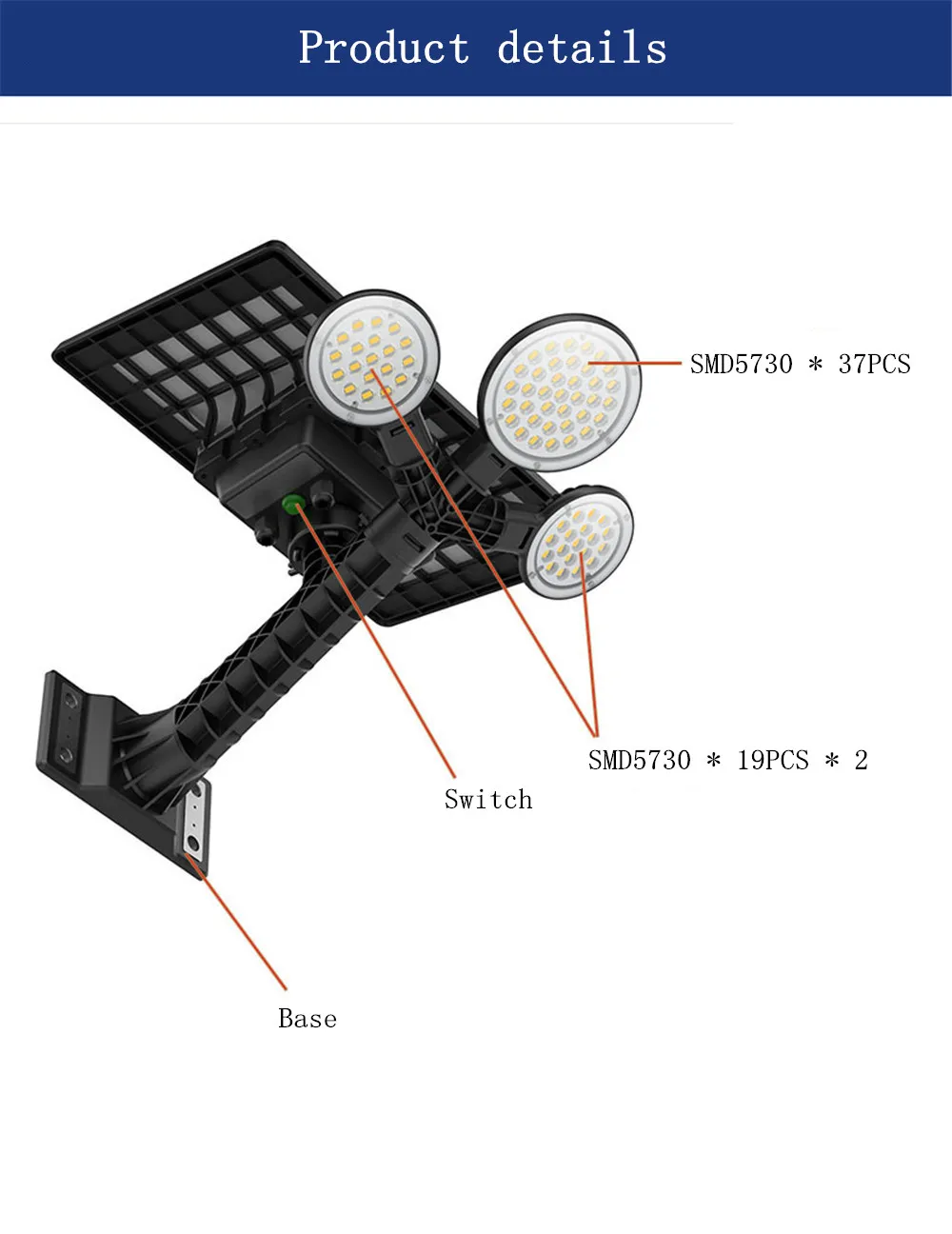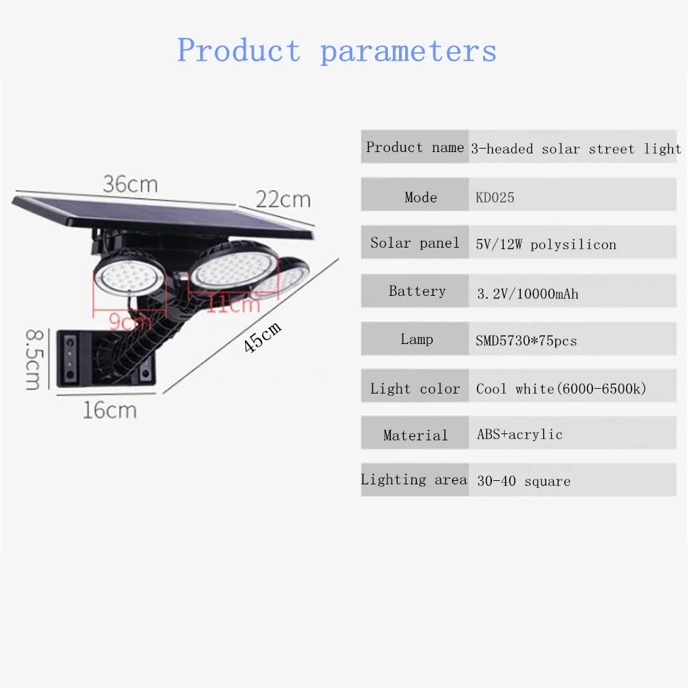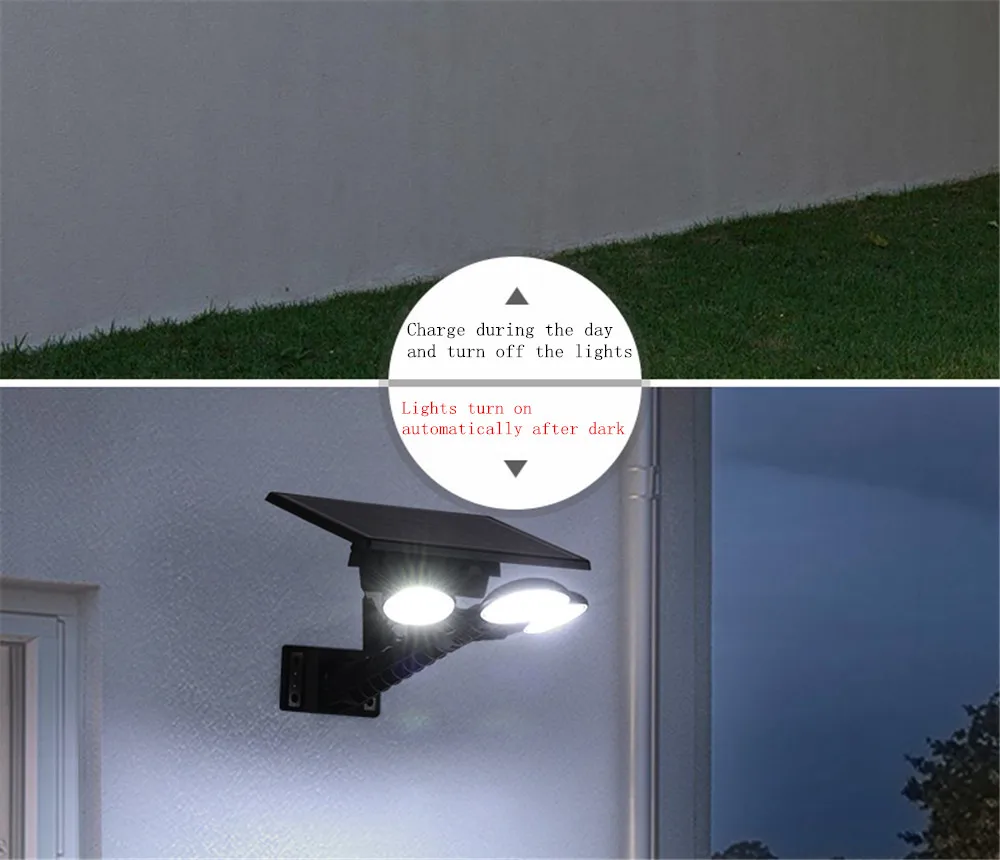 Параметры: Солнечная панель: 5 В 12 Вт поликремний Батарея: литиевая Батарея 3,7 V 10000 мА · ч (входит в комплект) Световой поток: около 1000Lm Спецификация светодиодный: SMD5730 * 75 шт. Цветовая температура: холодный белый Площадь освещения: около 30-40 квадратных метров Режим работы: всегда светильник Функция дистанционного управления: затемнение, синхронизация Время зарядки: 8 часов Время освещения: 7-9 часов Материал: АБС + акрил Водонепроницаемый: IP65 Рабочая температура: -20 ° ~ + 60 ° Высота установки: 2,5-3 м Подходящие места: наружные ворота, стены, дороги, внутренний двор, коридор, кемпинг. 1. Функция переключения A. Включите переключатель, чтобы включить (всегда включается светильник, пока питание не выключено) B. Поверните выключатель, чтобы выключить светильник 2. Установка шаги A. Просверлите отверстие на стене и поместите расширение для гвоздя в Б. Используйте винт, чтобы установить солнечный светильник на стене C. Установите его там, где он может поглощать солнечный свет, а затем включите переключатель Совет: время работы солнечной лампы полностью зависит от интенсивности солнечных лучей и времени облучения, положения установки, времени солнечного освещения должно быть более 6 часов, лучший светильник-от 10 до 16 вечера.