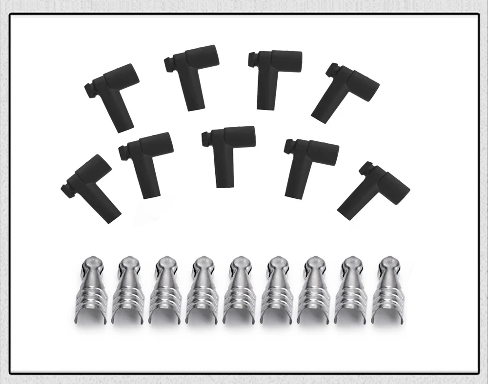 Great for replacement car or motorcycle spark plug wire. Simply crimp onto your current spark plug wire with pliers or wire crimp and be finished with your new terminal and boot!Refresh your old and worn out terminals or boots with new ones! Sold as pack of 9 as a perfect package size for your toolbox or small custom project.Dimensions& Material & Color: