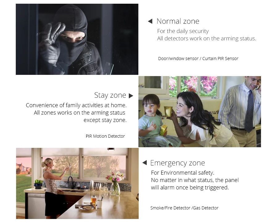 Установите мобильное приложение, чтобы получить оповещения немедленноМобильное приложение может удаленно управлять хостом сигнализации, удобно и быстро.Эта аварийная система W18 имеет возможность подключения к 2,4G Wi-Fi и GSM, а это означает, что его функция такая же, как и телефон. Он может позвонить вам или отправить сообщение вам, как только кто-то вызовет в зону обороны, чтобы сохранить вашу домашнюю безопасность. С бесплатным приложением (доступно для устройств iPhone и Android) на свой мобильный телефон, вы можете легко достичь дистанционного управления. Более того, есть 99 зон для установки. Зона 91 может использоваться в качестве дверного звонка, а зона 92-в качестве приветственного звонка.