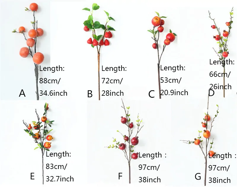 Характеристика: Название: хурма, гранат фруктовая ветка Материал: пластик, шелковые цветы Цвет: 10 видов A: длина: 88 см/34,65 дюйма; B: Длина: 72 см/28,35 дюйма; C: длина: 53 см/20,87 дюйма; D: длина: 66 см/25,98 дюйма; E: длина: 83 см/32,68 дюйма; F: Длина: 97 см/38,19 дюйма; Г: длина: 97 см/38,19 дюйма; Размер: Как показано на картинке. Посылка: 1 шт.