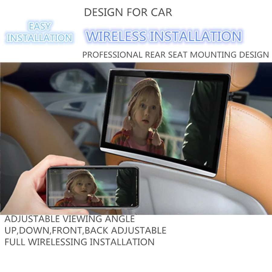 Со специальным монтажным дизайном, специально для развлечения на заднем сиденье автомобиля, вы можете регулировать угол обзора, вверх и вниз, вперед и назад. Самое главное, вам не нужно подключать проводное соединение, Вы можете DIY монтаж в течение 5 минут без какого-либо подключения проводки