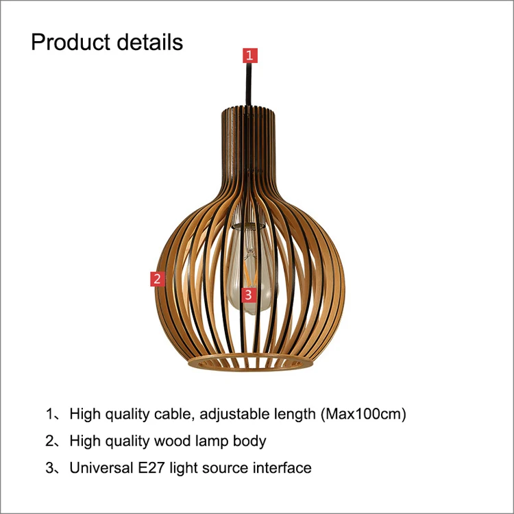 Материал: дерево Цвет поверхности: черный, белый, цвет дерева (как на фото) Источник: светодиодный светильник Стальные кабели: 120 см, регулируемая высота Размер: d23см * h30см; D35см * h46см; D45см * h54см; D54см * h68см Входное напряжение: 110-240 В ? Тип цоколя: E27 Лампочки включены: нет