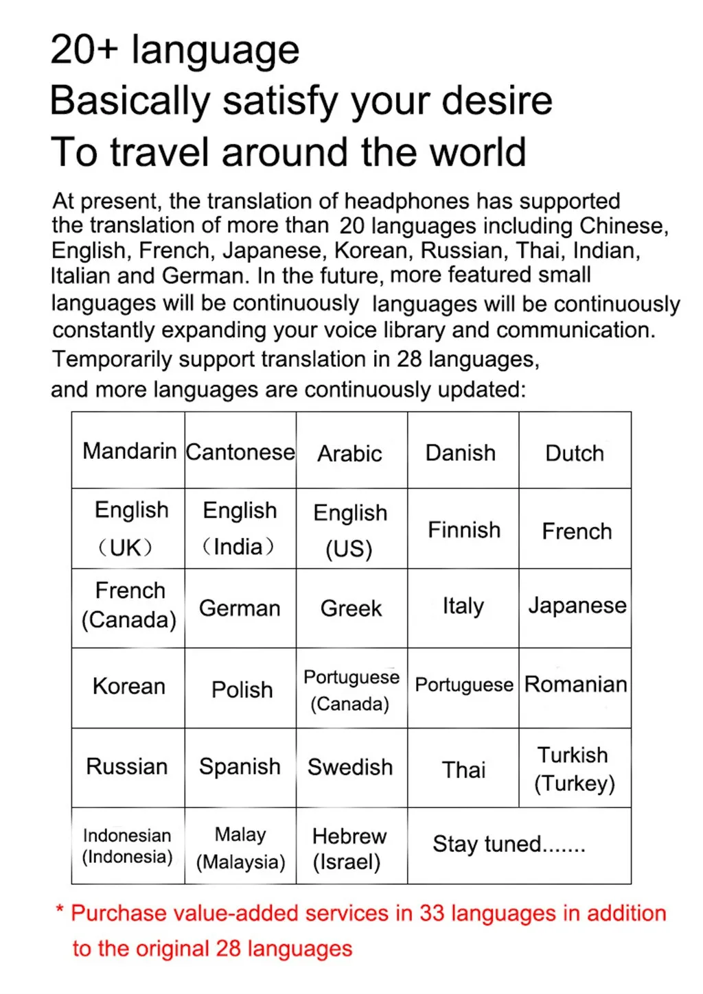 Умный Переводчик: в обычном использовании это bluetooth-гарнитура. Он имеет все функции обычных bluetooth-гарнитур, таких как ответ на звонки и прослушивание музыки. Когда вам нужна функция перевода, нам нужно только открыть приложение для сопряжения гарнитуры, которое имеет 20 языков и поддерживает Взаимный перевод на различных языках.Беспроводное соединение Bluetooth True: Оптимизированная версия Bluetooth 5,0 позволяет вам стабильную и быструю передачу звука, беспроводное соединение echte на расстоянии до 10 метров, легко для ваших устройств Bluetooth может быть по всему миру.Посылка список: