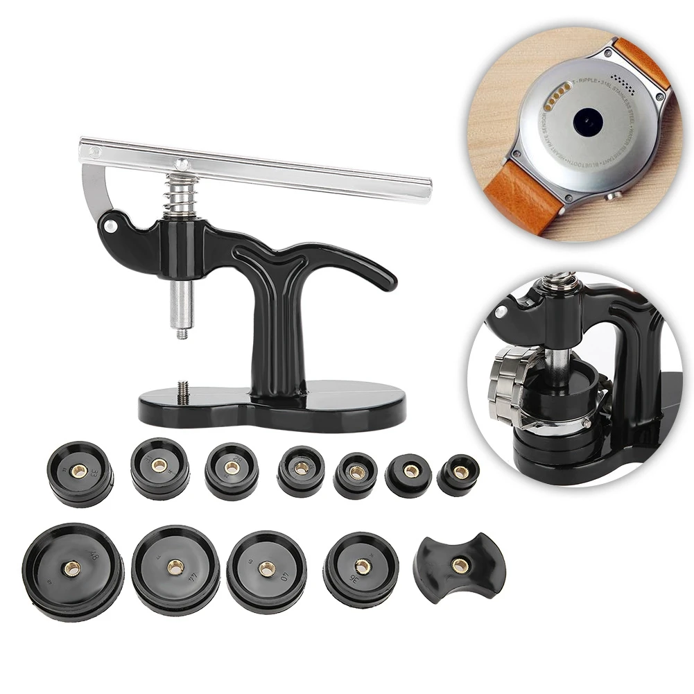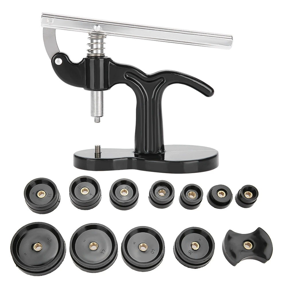Набор инструментов для обратного пресса часов с 12 штампами от 18 мм до 50 мм, Fypo пресс-набор из литого металла для обеспечения прочности, поверхность ручки имеет полосы, Нескользящие и прочные. Черные инструменты для ремонта часов, высокое качество и уникальный внешний вид, основание имеет четыре резьбовых отверстия, хорошая стабильность. Система оснастки позволяет матрицам быстро подключаться и выключаться. Высококачественная компрессионная пружина, идеально подходит для закрытия наручных чехлов. Он поставляется с ассортиментом из 12 штампов для всех размеров часов.