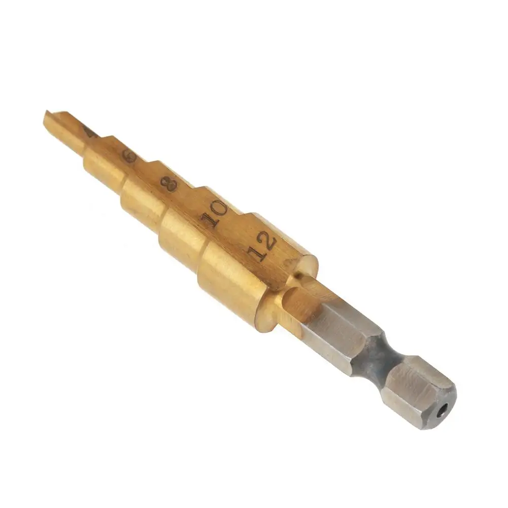 HSS шаг конус титановое покрытие сверло резец отверстия, изготовлен из высококачественной стали HSS с титановым покрытием для уменьшения трения и тепла, который используется для резки тонкой железной пластины, алюминиевого материала, изоляционной пластины, ПВХ пластины и многое другое. Уникальная ступенчатая структура дают возможность открывать различные размеры отверстий.