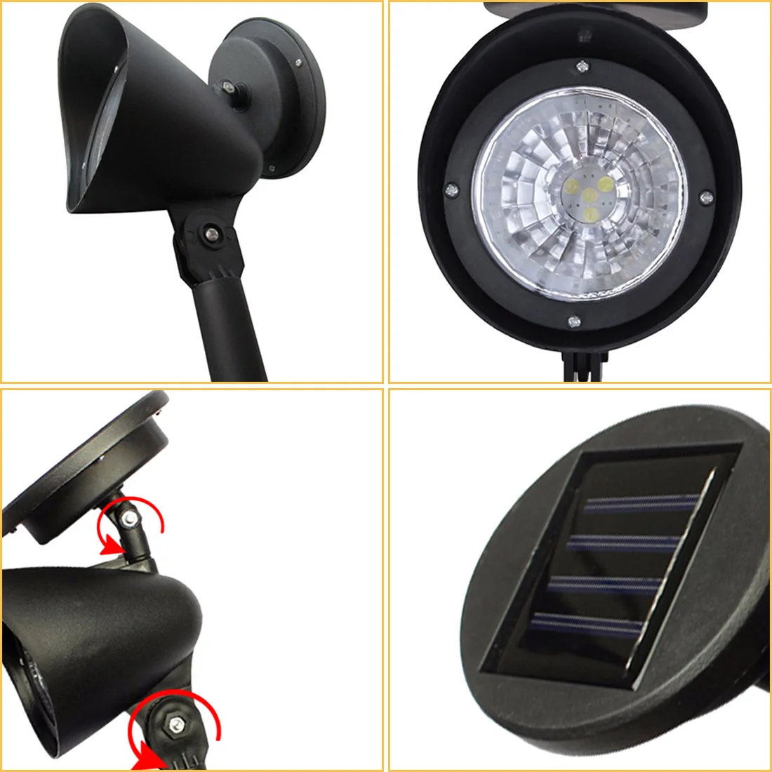 Пластиковая конструкция и черная отделка беспроводной низкое энергопотребление и энергосберегающая перезарядка солнечными панелями под солнечным светом низкое напряжение, без мерцания, без бликов простой дизайн соответствует различным ландшафтам и стилям, разработанным для всех погодных условий, экологически чистый автоматический датчик активируется в сумерках длительный срок, легко установить можно установить вертикально или горизонтально. Регулируемая подставка позволяет направлять свет под разными углами долговечная светодиодная лампа 100000 часов технологии