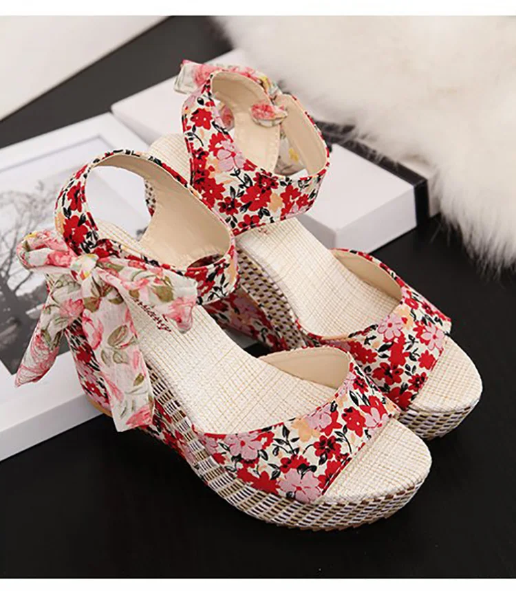 Женские босоножки на шнуровке; Босоножки на платформе с открытым носком; Scarpe Donna; пикантная обувь на танкетке с цветочным принтом; обувь в стиле бохо на толстой подошве; Летняя женская обувь