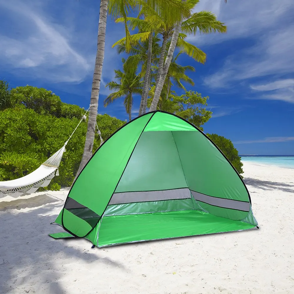 Эта палатка легко всплывает за считанные секунды и обеспечивает прохладное и просторное укрытие для 2 - 3 человек. Он изготовлен из полиэфирной ткани с серебряным покрытием, водостойкий и устойчивый к ультрафиолетовому излучению. С доставкой в течение 3-боковой сетчатый дизайн, вы можете наслаждаться Бриз будет защищен со всех сторон. Он легкий и компактный после сложения в сумку для переноски, идеально подходит для путешествий, кемпинга, пеших прогулок, пикника и других видов активного отдыха.