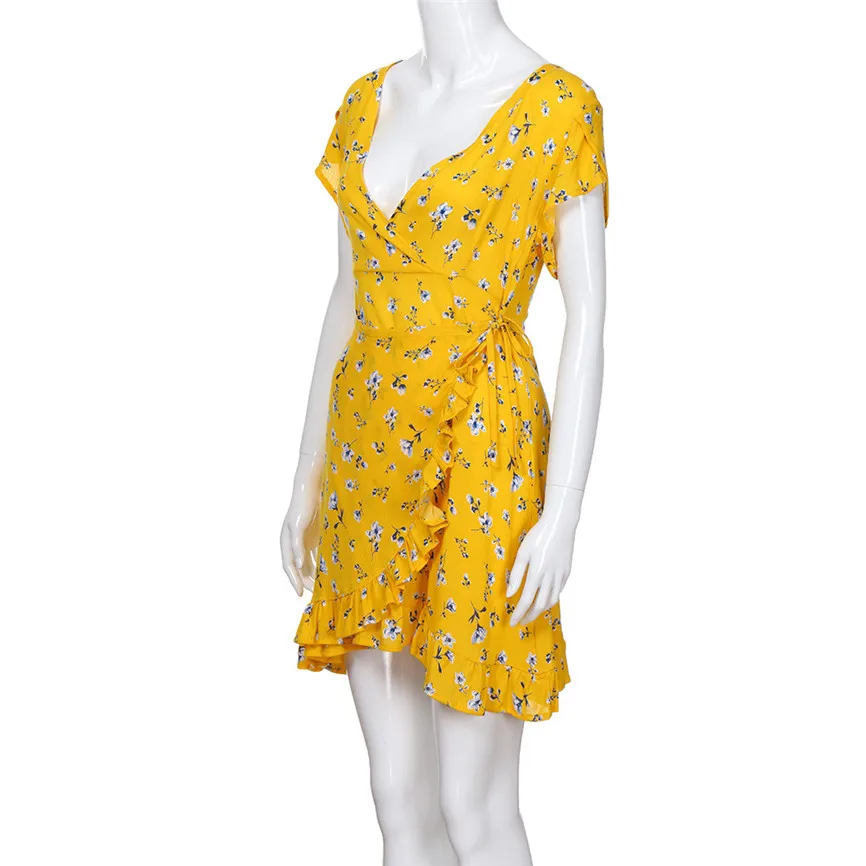 Женское Короткое платье мини, повседневное вечернее платье с v-образным вырезом и коротким рукавом, лето 2019