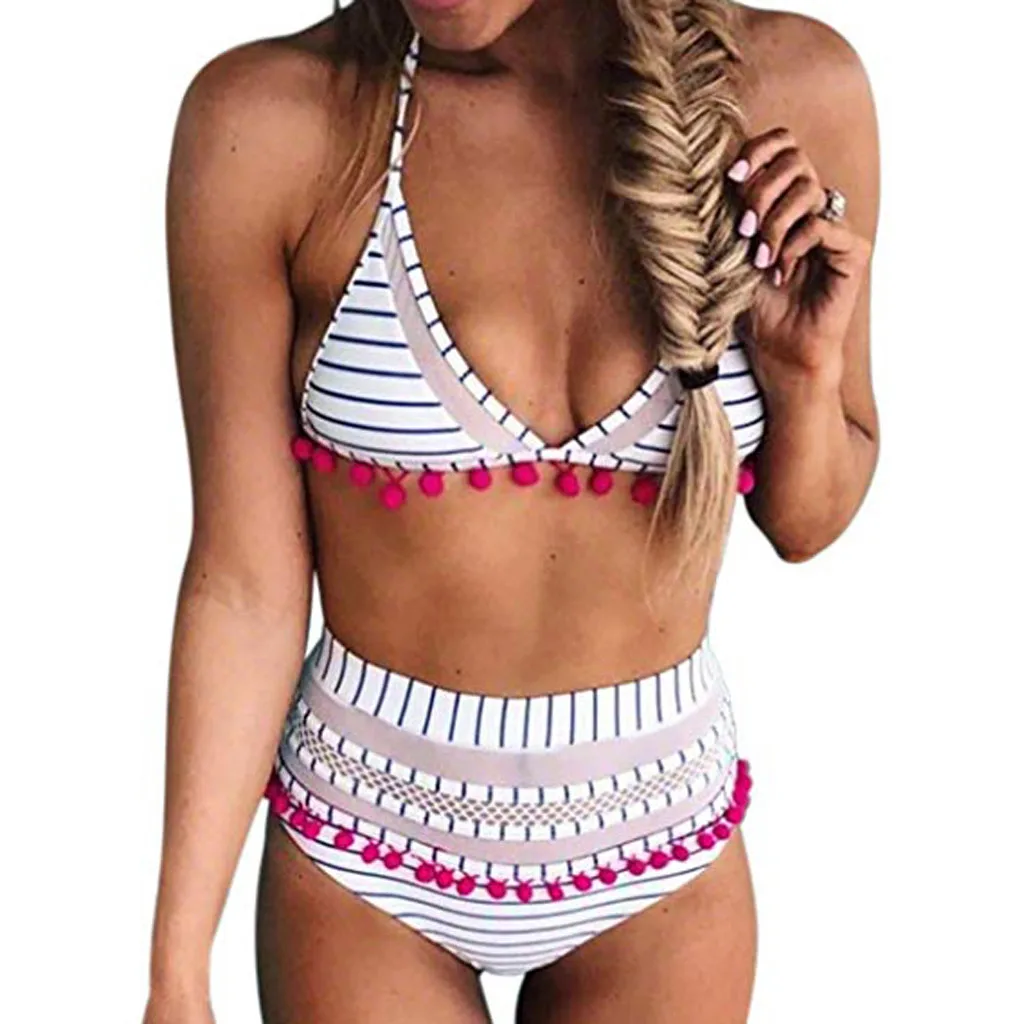 Женский комплект бикини из двух предметов с высокой талией, полосатый купальник с кисточками