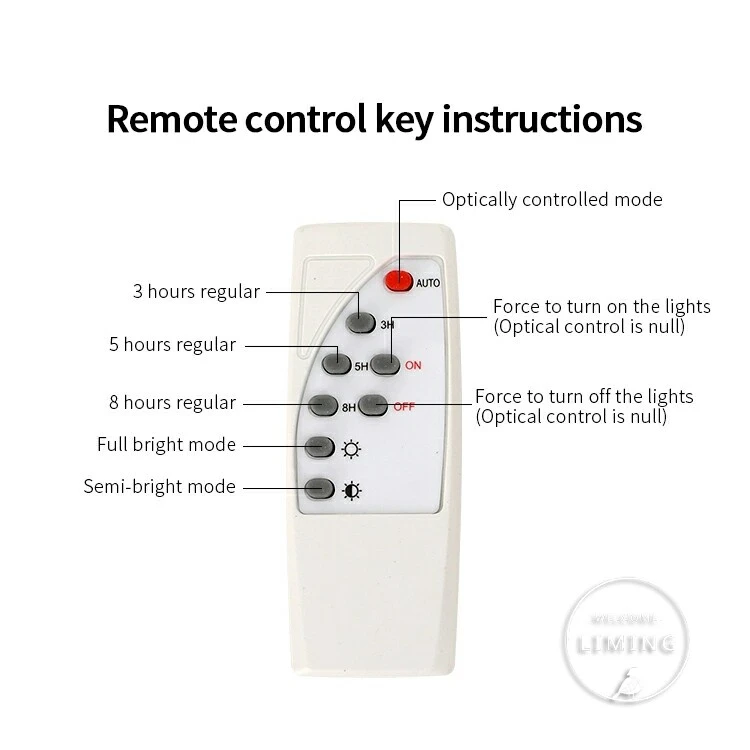 -Пульт дистанционного управления (режим 1: автоматический светильник, светильник включается в сумерках и выключается как рассвет; Режим 2: Таймер светильник в течение 3/5/8 часов или держать его ВКЛ/ВЫКЛ в любое время. Режим 3: половина светильник на основе режим 1 или 2)