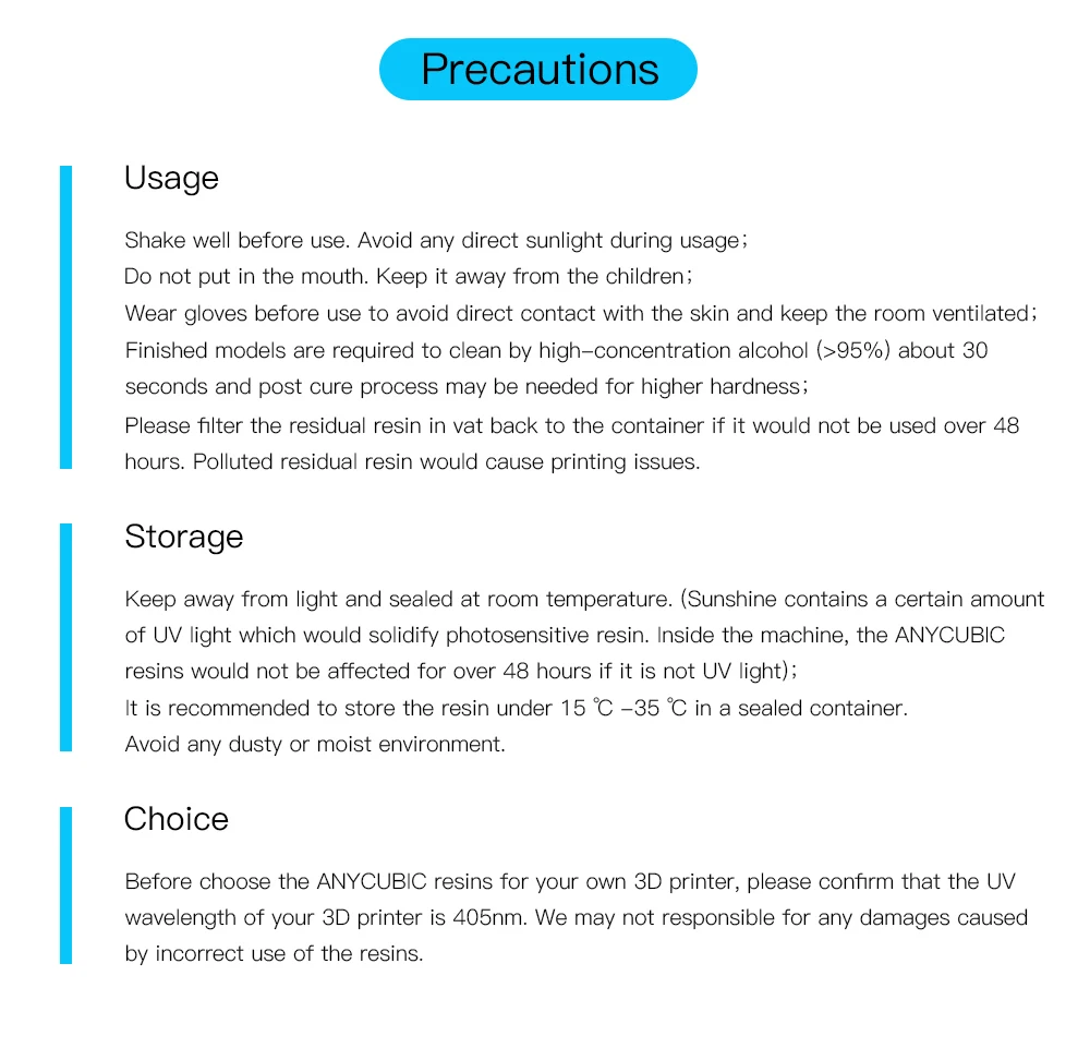 Рекомендуется хранить при температуре окружающей среды 15-35 ℃, чем ниже температура, тем выше вязкость смолы. Герметичный, пыльный или влажный, влияющий на качество печати. Сохранение затенения, солнце содержит много ультрафиолетового светильник, будет вылечивать фоточувствительную смолу.