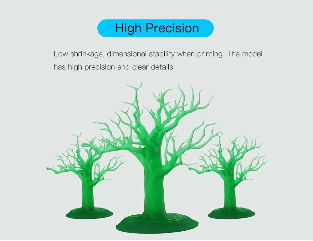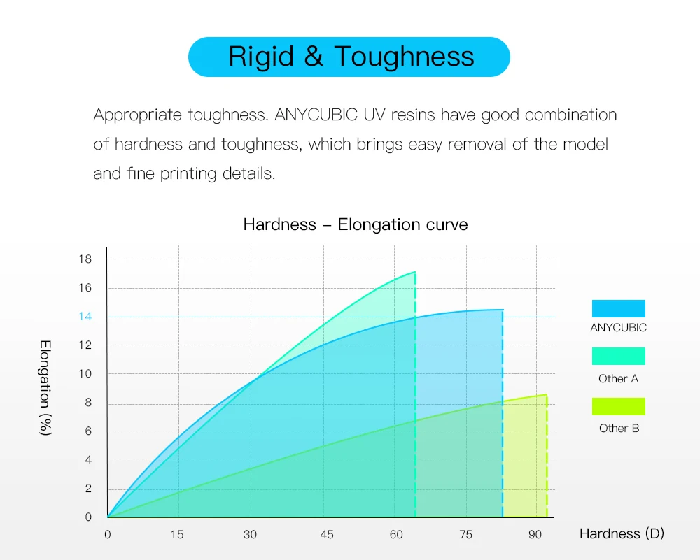 Подходящая прочность. ANYCUBIC UV смолы имеют хорошее сочетание твердости и твердости, что обеспечивает легкое удаление модели и тонкой печати деталей