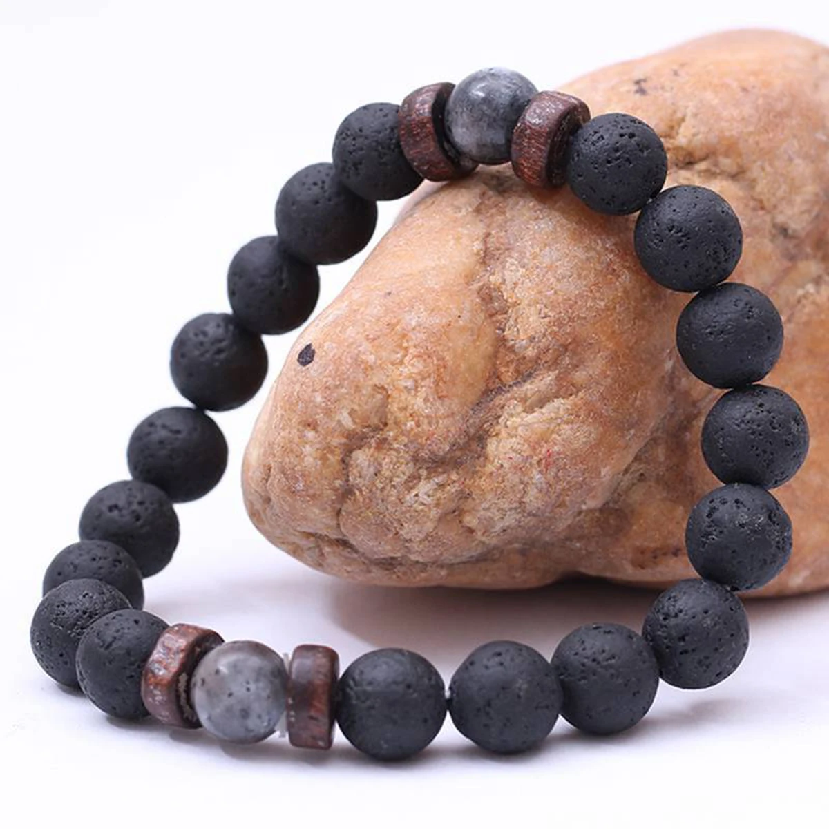 Материал бусин: лавовый камень, 8 мм ларвинит/черный лунный камень, деревянные прокладки