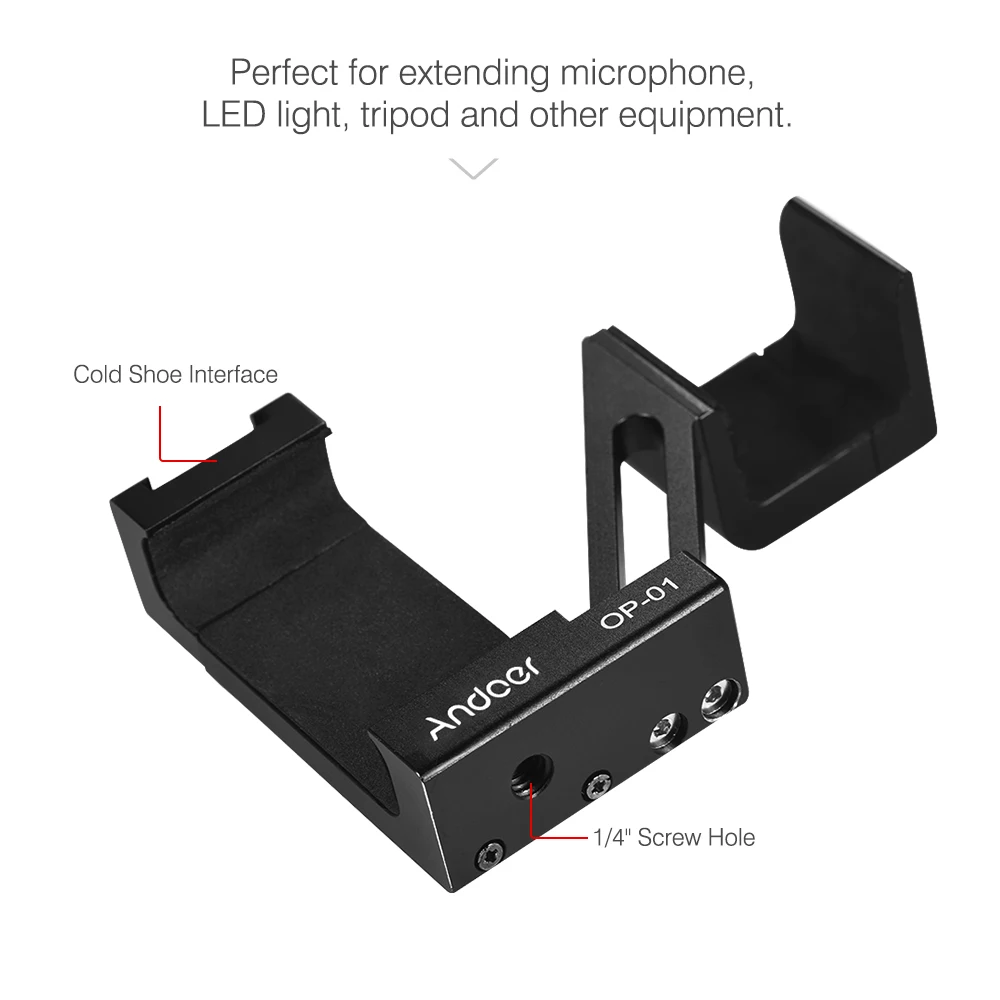 Верх с интерфейсом холодной обуви, дно с 1/4 дюймовым винтовым отверстием, идеально подходит для расширения микрофона, светодиодного светильника, штатива и другого оборудования.