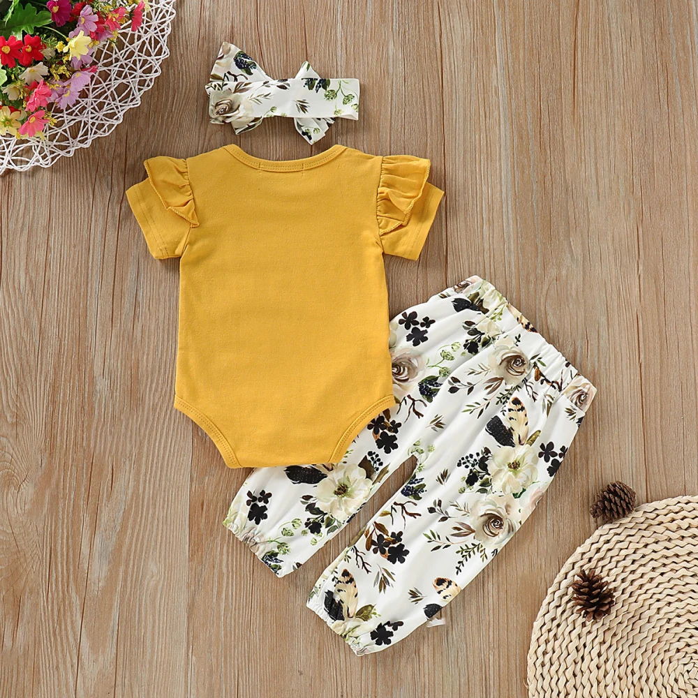 AU/топы для новорожденных девочек; Комбинезон с цветочным рисунком; Штаны; Повязка на голову; Комплект одежды из 3 предметов
