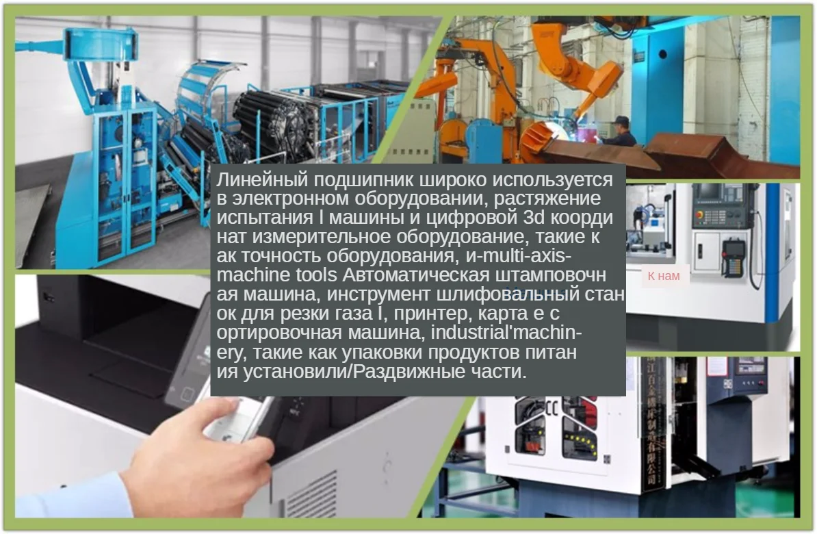 Линейный подшипник широко используется для электронного оборудования, испытательных машин на растяжение и цифрового 3D оборудования для измерения координат, например, приборов для определения точности, многоосных станков, автоматических штамповочных машин, шлифовальных станков, газорезательных машин, принтеров, сортировщиков карт, промышленных машин, например, детали для движения пакетов с продуктами питания.