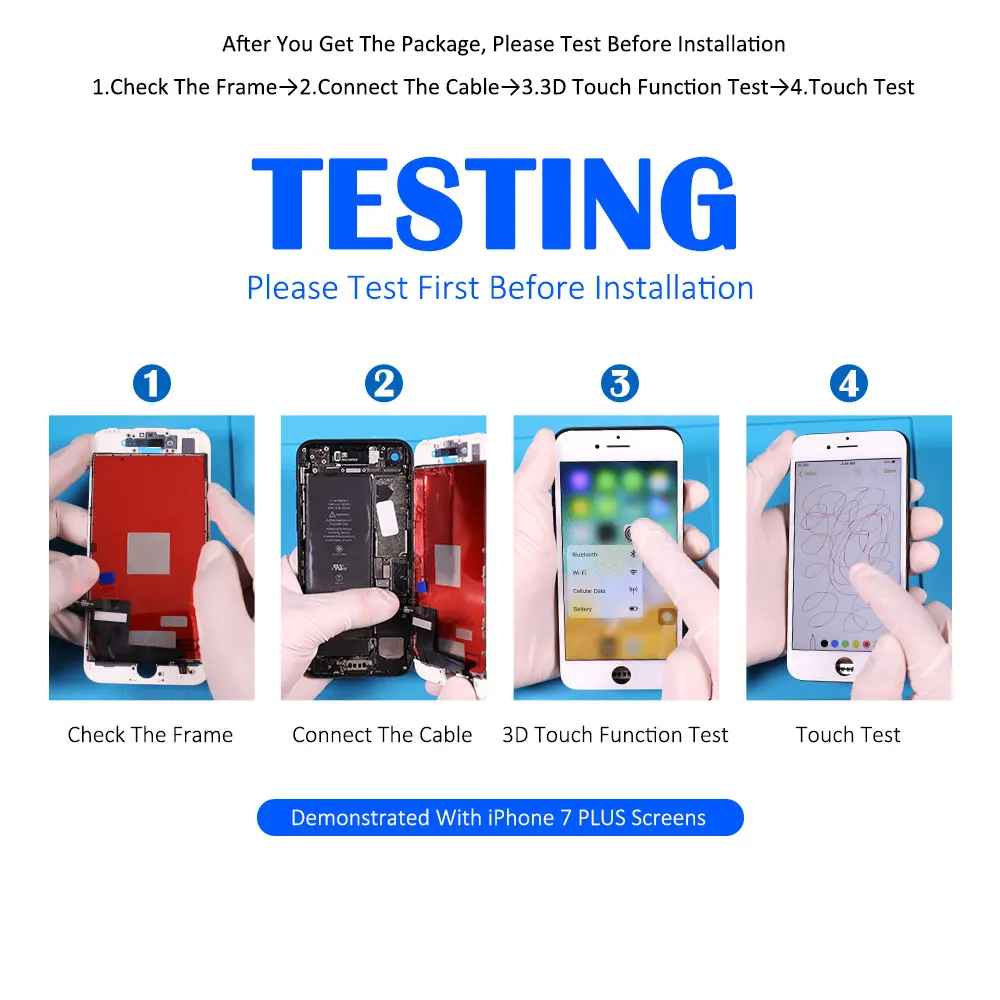 1. Детали: внешнее стекло + ЖК-экран + сенсорная панель дигитайзера + Переднее кольцо для камеры + Датчик-светильник + Пыленепроницаемая сетка для ушей, предварительно собранная. 2. Подходит для iPhone 7 3. Цвет: черный и белый. 4. Контроль качества: Каждый экран был протестирован перед отправкой и работает на 100%. 5. Посылка: поставляется в антистатическом пакете + пузырчатом пакете, безопасная упаковка. 6. Гарантия: мы предлагаем гарантию на 6 месяцев (гарантия аннулируется, если ЖК-дисплей/гибкий кабель/Рама повреждена после установки или во время установки).