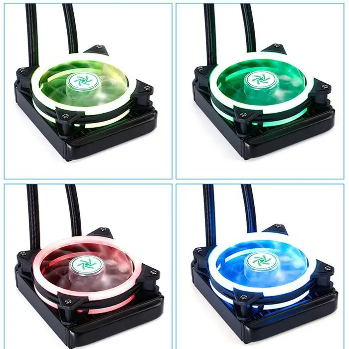 Material: Rubber tube, woven mesh Color: Black Pack Size: 210mm x 250mm x 130mm Weight: 1.180 kg Type: CPU Radiator Quantity: 1Pc Features: Good quality, long service life. Professional design. LED RGB breathing light. PWM fan RGB light. Pump head RGB red, blue, white, green, purple, orange, yellow, seven colors RGB automatic cycle switching. Package Content: 1 x CPU Radiator Note: Due to the difference between different monitors, the picture may not reflect the actual color of the item.1cm=0.3937inch