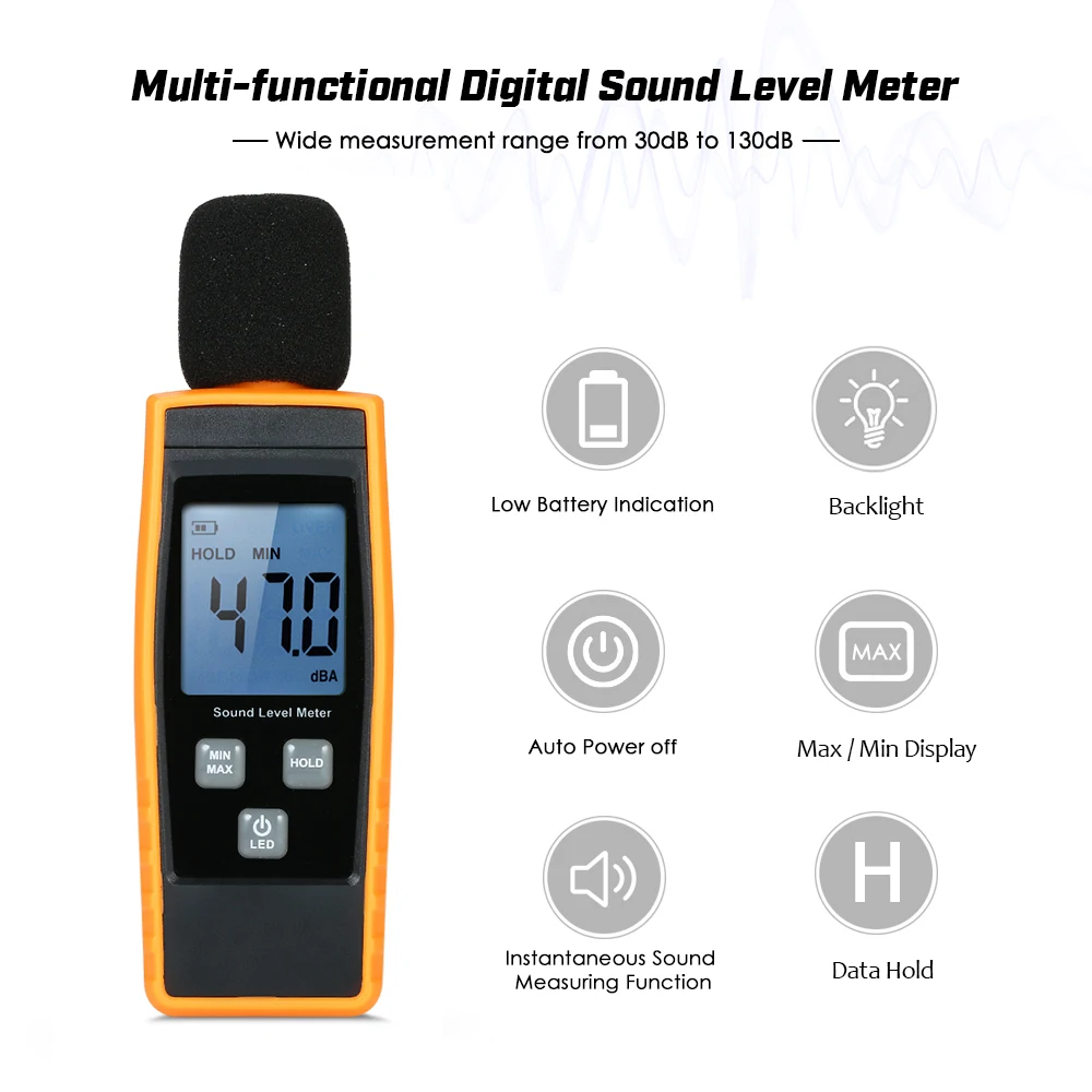 Хотите проверить уровень звука? Нужно знать уровень шума для контроля уровня звука? Попробуйте этот удобный измеритель уровня звука, он оснащен широким диапазоном измерений, который измеряет уровень звука от 30dBA ~ 130dBA. Он может быть широко использован для мониторинга уровня звука в домах, офисах, школах, фабриках, дорожном движении, аудиосистеме, строительной площадке и т. д.