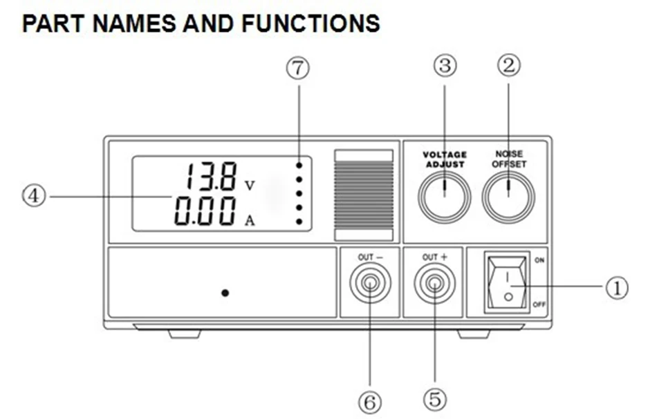 Панель Особенности: 1: выключатель питания 2: Регулировка фильтрации шума 3: Регулировка выходного напряжения постоянного тока 4: ЖК-напряжение, отображение тока 5: Положительный выход постоянного тока 6: Выход постоянного тока отрицательный 7: пройденное расстояние в индикации тока 8: положительный и отрицательный выходной терминал постоянного тока 9: Вентилятор охлаждения 10: Электрический предохранитель высокого качества Точные параметры: > Размеры (Ш x В x Г): 155 (Ш) x 70 (в) x 205 (D) мм > Вес: 1,5 кг > Выходное напряжение: 9- 15 В постоянного тока регулируемое, подходит для фиксированного 13,8 В постоянного тока > Выходной ток: 30A (максимум) > Пульсация и шум: <10 мВ RMS > Мощность: 230 В переменного тока/50 Гц > Тип инструмента: ЖК-цифровой измерительный прибор