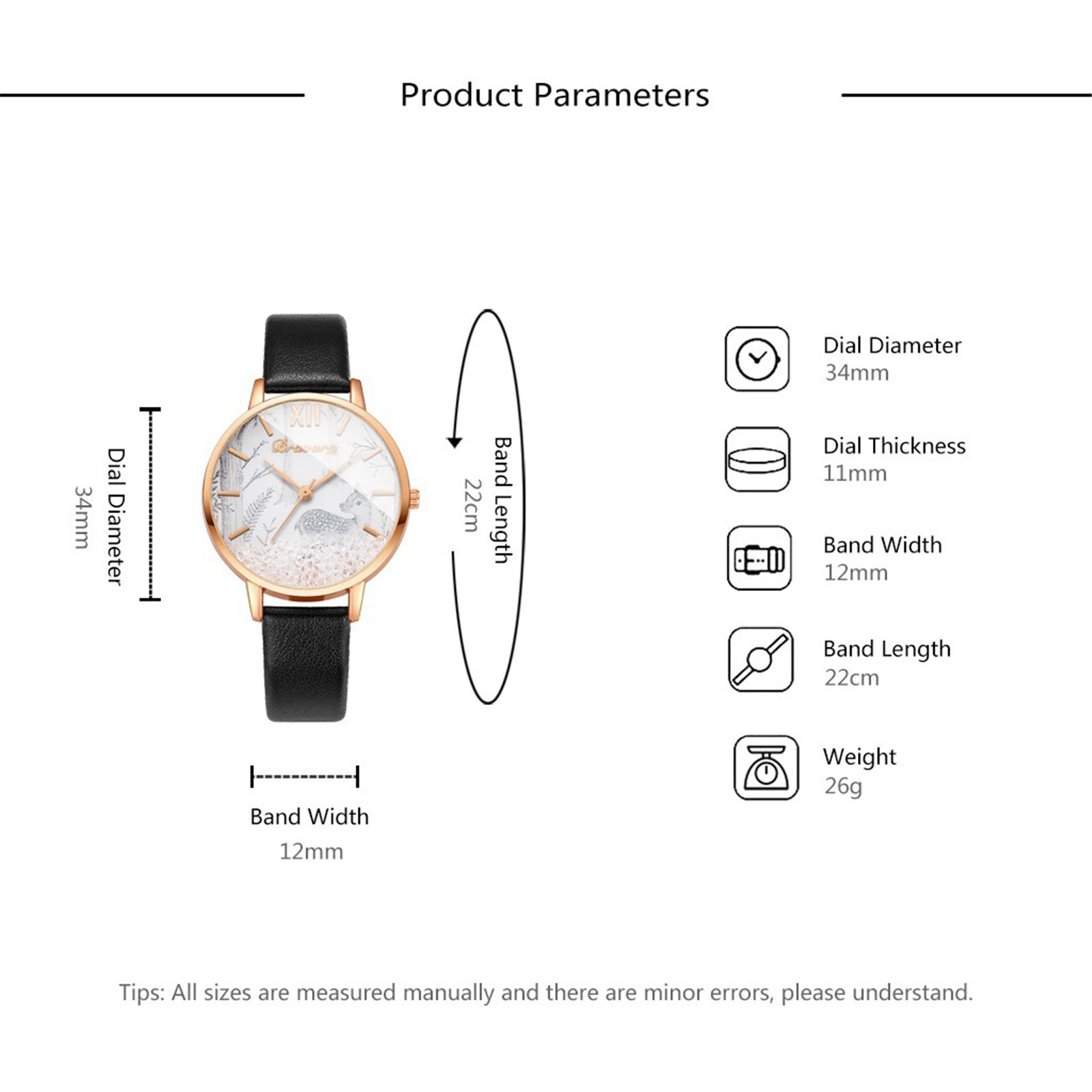 Чехол диаметр: 34 мм Толщина циферблата: 11 мм Длина ремешка: 220 мм (включая чехол) Ремень Материал: искусственная кожаГоловка Материал: сплав