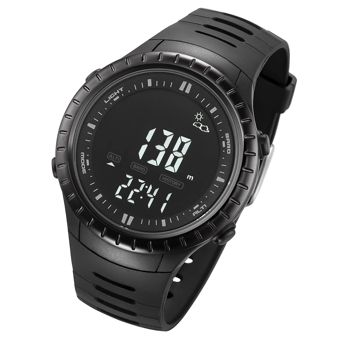 Многофункциональный с барометром, высотомером, термометром, прогноза погоды, временем и данными.