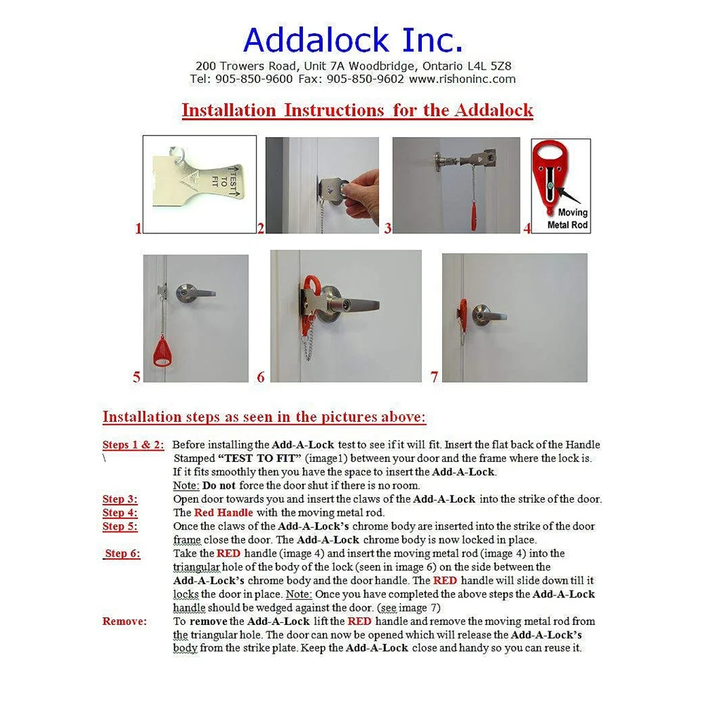 Это портативный дверной замок, который может быть легко установлен и удален за считанные секунды на любой двери, которая открывается внутрь, что дает вам дополнительную безопасность, безопасность и конфиденциальность за ним. Используйте его на передней двери вашего дома и Возьмите один с собой во время путешествия.