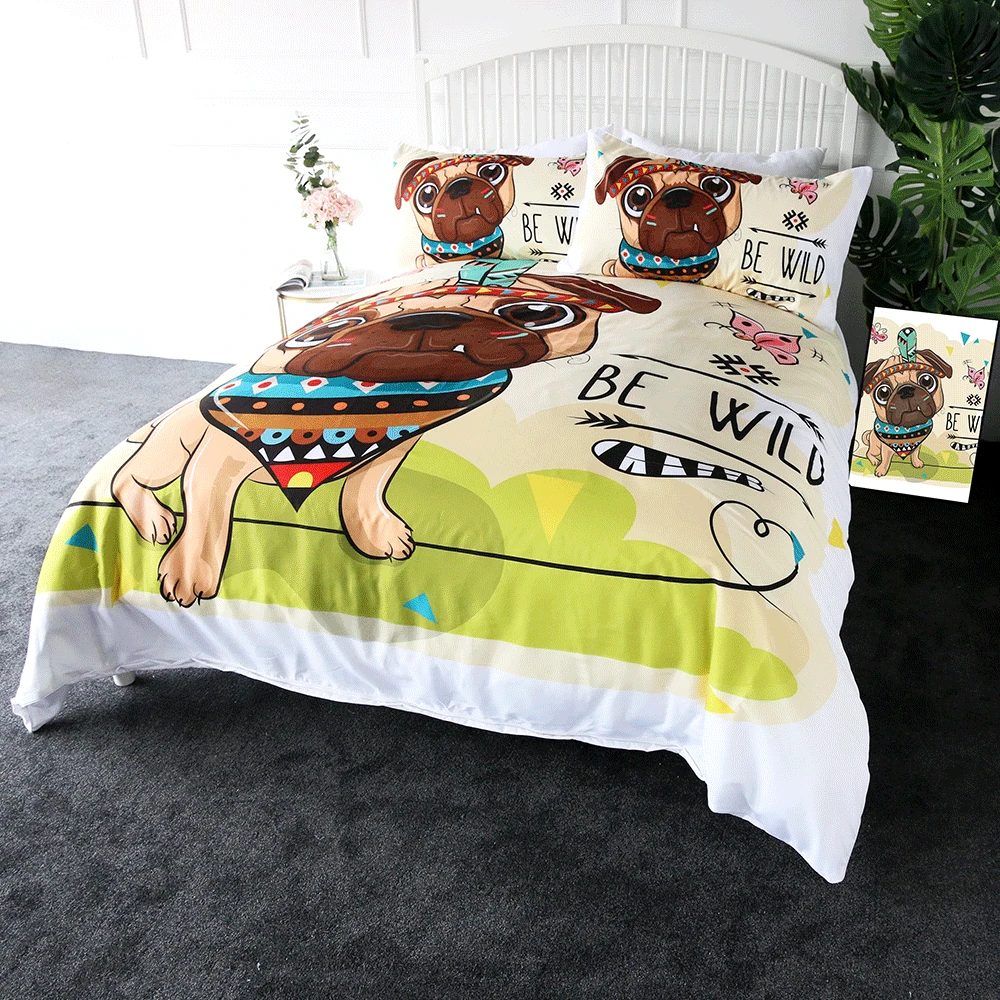 Название товара:Комплект постельного бельяУпаковочный лист:1 * пододеяльник + 2 * наволочкиТкань:ПолиэстерСезон:Весна, лето, осень, зимаОсобенности:Милый мультяшный этнический Мопс с пером, идеальный подарок для любого, кто любит щенка.