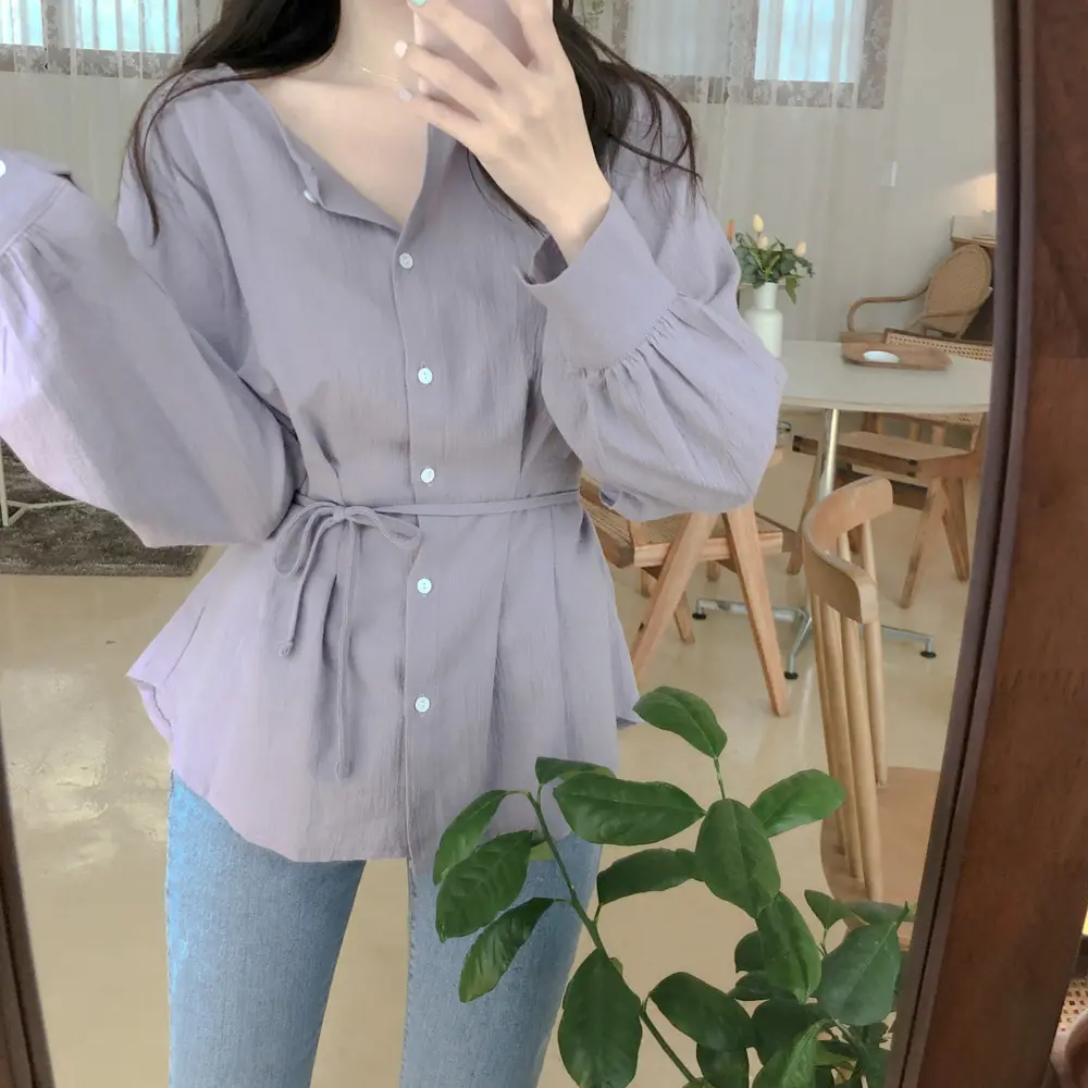 Милые сладкие топы, женские корейские девушки в японском стиле преппи, женский дизайн, пояс и галстук-бабочка, фиолетовая белая рубашка на пуговицах, женские блузки