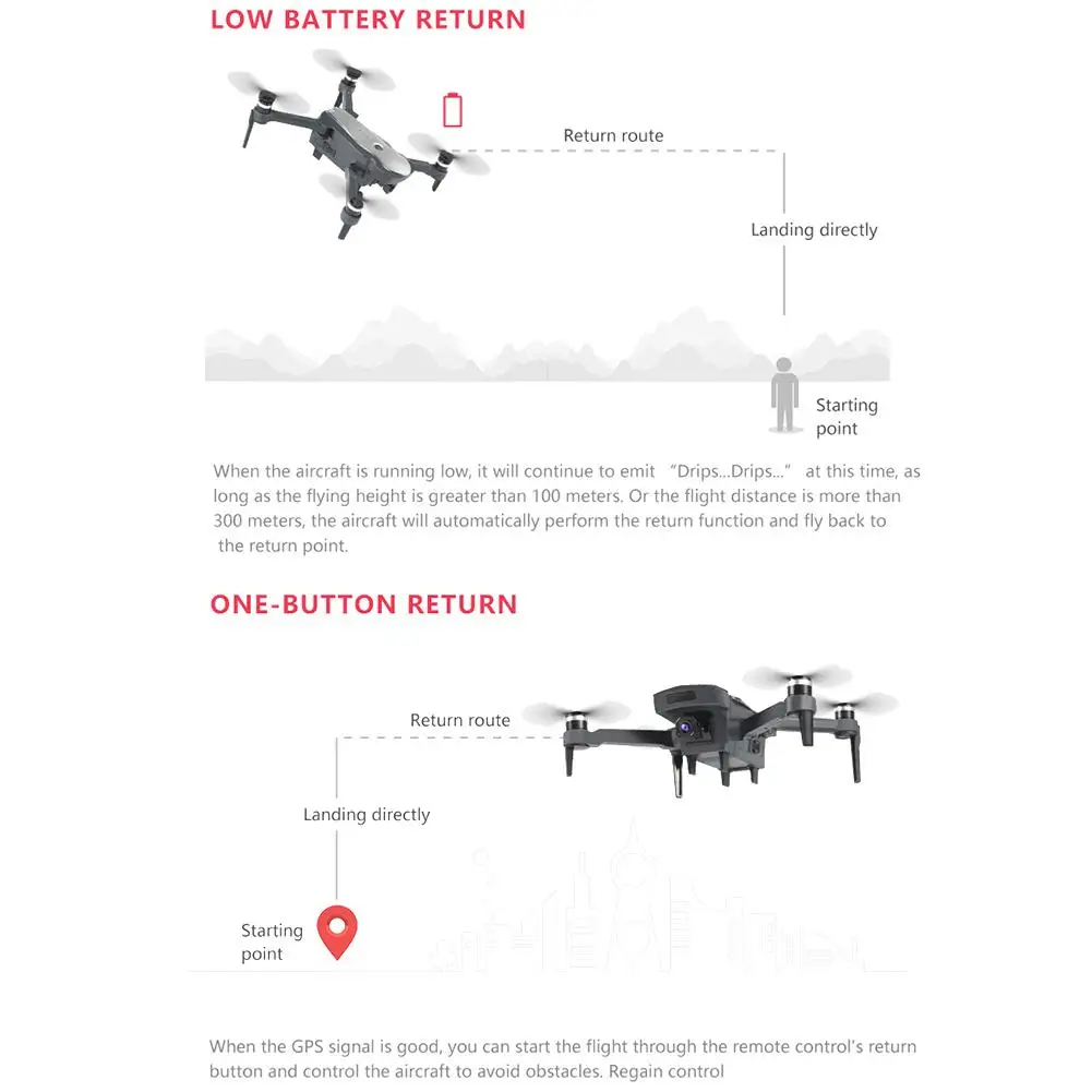 4. Более стабильный gps-сигнал: на 200%-300% больше дистанции управления (1800 м), чем у других обычных дронов, полет более интересен и безопасен. Благодаря улучшенному позиционированию GPS он может стабилизировать парение, снимать изображения с более высоким разрешением и точно возвращать домой.