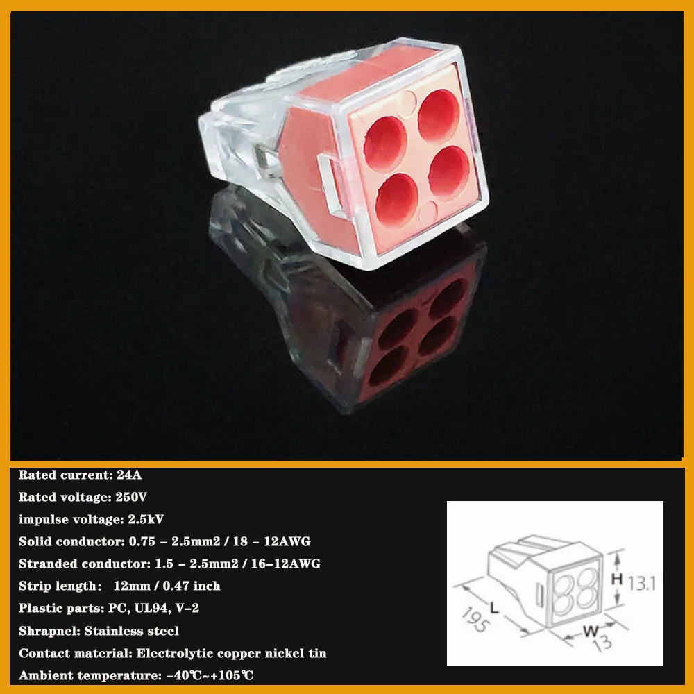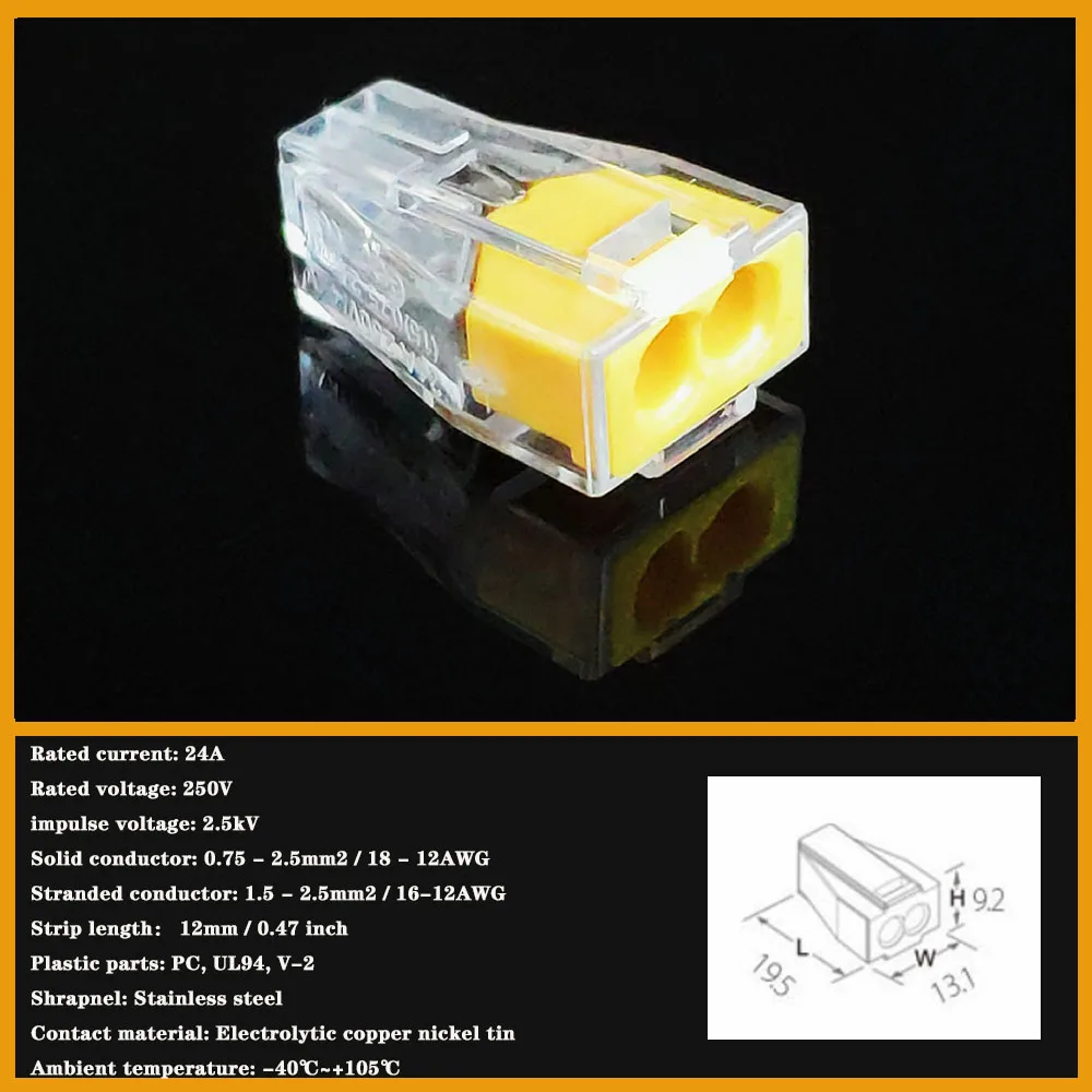 Название продукта: домашний соединительный провод/провода соединители/провода соединительные клеммы/разъем питания/гнездо разъемаНомер модели: 102/104/106/108Материал изоляции: модифицированный нейлон (PA66)Материал контакта: Фосфорная медьНазвание продукта: соединитель провода