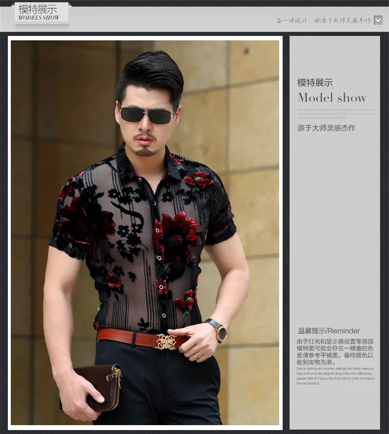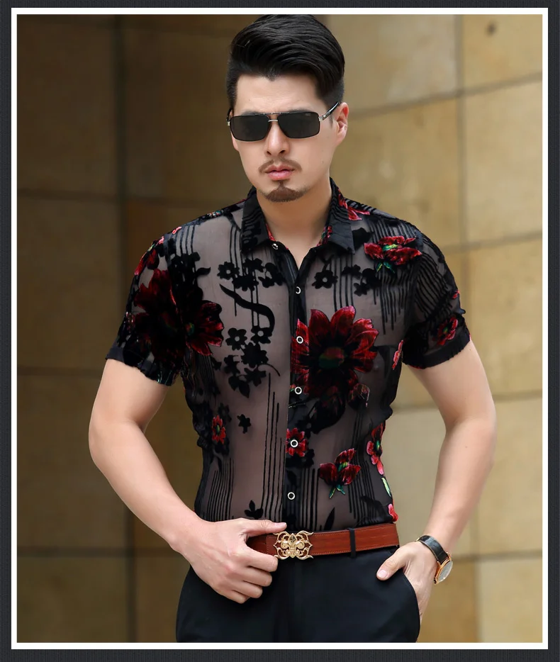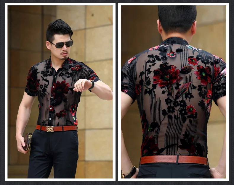 Прозрачная бархатная рубашка с цветочным принтом, Мужская Прозрачная кружевная рубашка, мужские Клубные вечерние рубашки с цветочным принтом для DJ выпускного вечера, рубашка с коротким рукавом Chemise Homme