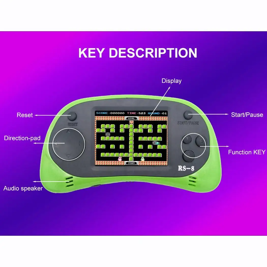 Технические характеристики: Материал: ABS Пластик 3 цвета: белый, зеленый, темно-синий Игровая программа: Хост встроенный 168в1, 260в1 Размер памяти: минимальный 64 МБ, максимальный 128 Мб Размер экрана: 2,5 дюймов TFT lcd цветной экран Поддержка: выход AV, регулировка громкости, зарядка через USB Батарея: 3 х с питанием от аккумуляторной батареи AAA (не входит в комплект) Особенности: Ультратонкий умный мини-размер с удобными ручками, 2,5-дюймовый дисплей, прочный внешний вид. Развлечения на открытом воздухе или в помещении: вы можете играть в скучных или дальних путешествиях, вы также можете играть по телевизору, и вы можете наслаждаться счастливыми часами с вашей семьей. Три аккумулятора AAA (не входят в комплект) поддерживают воспроизведение до 3-4 часов, создавая идеальное время воспроизведения. Отличный подарок для кого-то: Подарочная коробка, удивительный Рождественский подарок на день рождения для тех, кто любит старые школьные игры (дети, родители, друзья) Посылка в комплекте: 1 х игровая консоль, 1 х av-кабель, 1 х Руководство Примечание: Из-за разницы между различными мониторами изображение может не отражать фактический цвет изделия.