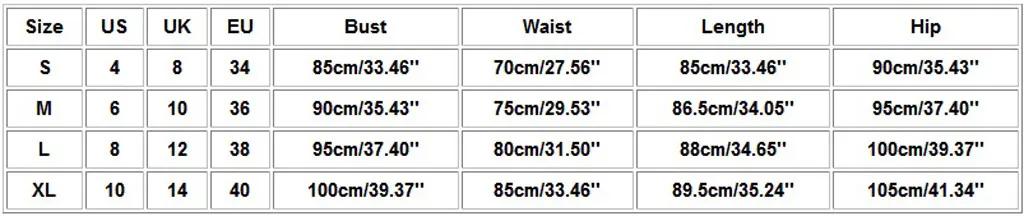 Size chart:SizeUSUKEUBustWaistLengthHipS483485cm/33.46''70cm/27.56''85cm/33.46''90cm/35.43''M6103690cm/35.43''75cm/29.53''86.5cm/34.05''95cm/37.40''L8123895cm/37.40''80cm/31.50''88cm/34.65''100cm/39.37''XL101440100cm/39.37''85cm/33.46''89.5cm/35.24''105cm/41.34''