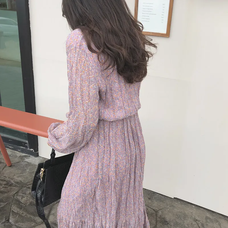 Женское винтажное платье в Корейском стиле с v-образным вырезом, винтажное платье с цветочным принтом, приталенное длинное платье