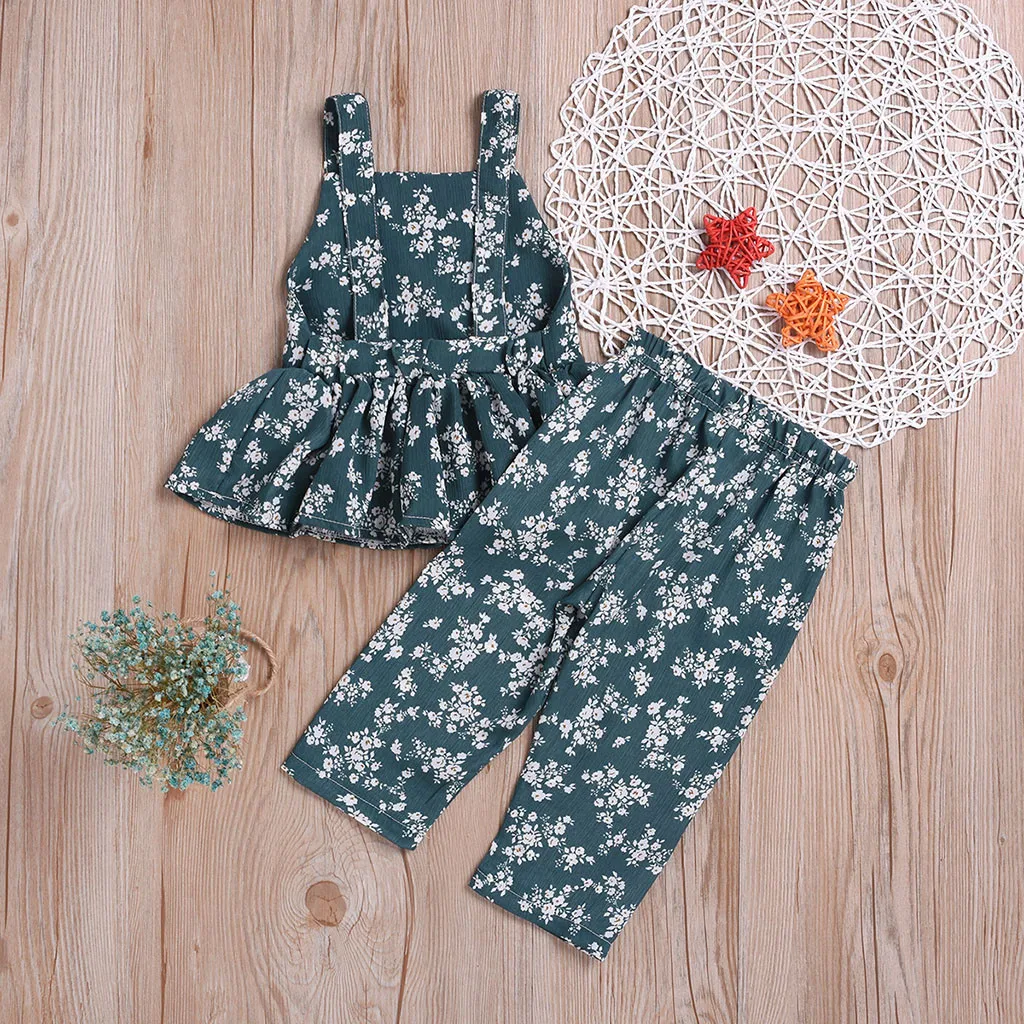 Одежда для малышей платье для девочек без рукавов, Цветочный принт жилет с вырезом на спине комплекты из футболки и штанов