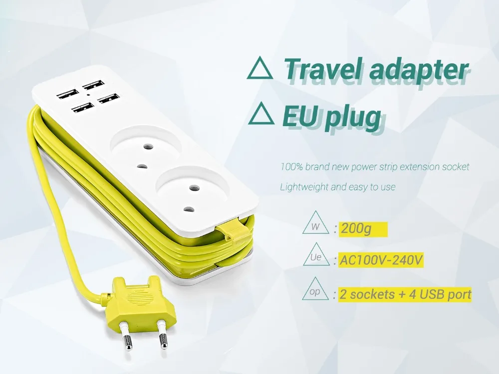 100% абсолютно новый удлинитель Легкий и простой в использовании Материал: огнеупорный Поликарбонат, медь Номинальное напряжение: AC100V-240V Номинальный ток: 10A Выход USB: DC5V 2.3A (поддержка быстрой зарядки 2A) Выходной порт: 2 гнезда + 4 порта USB Длина кабеля питания: около 150 см Размер продукта: 195x55x39 мм Вес изделия: 200 гПакет включает в себя: