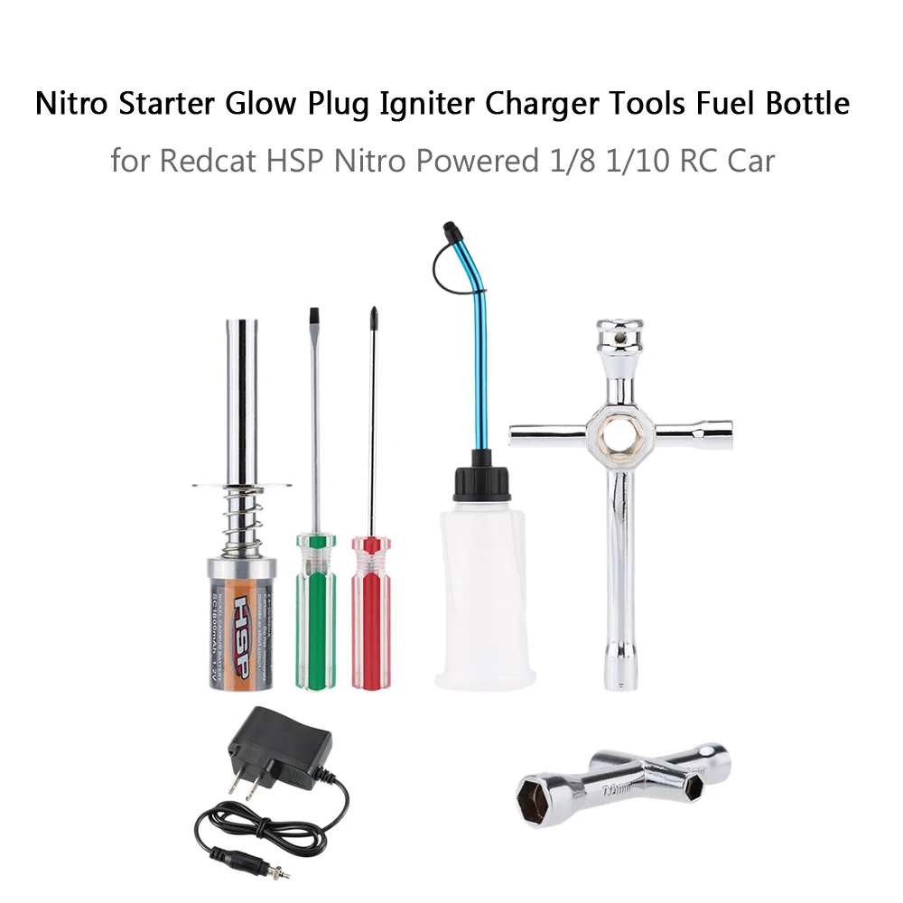 Это комбо может быть хорошим партнером для вашего nitro приведенного в действие 1/8 1/10 масштабе RC автомобиля. Перезаряжаемый стартер светящийся заглушка воспламенитель с зарядным устройством принесет много удобства для вас, и ремонтные инструменты, в которых может быть хорошим выбором для замены шин и других частей обновления.