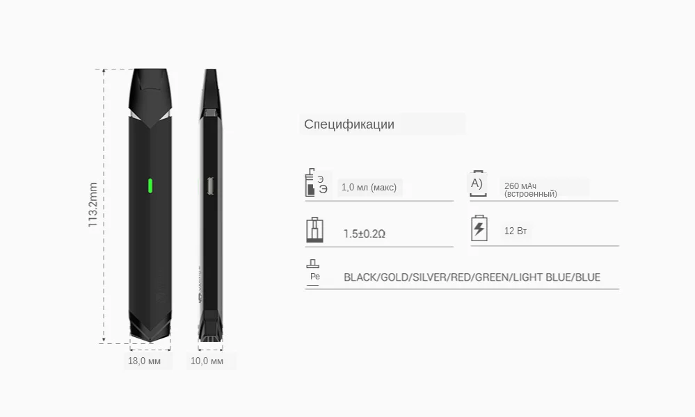 Тип: набор Размер: 113.2*18*10 мм Объем бака: 1.0 мл Аккумулятор: встроенный 260 мАч Диапазон сопротивления: 0,5-2,0 Ом Совместимость/разъем: 510 Материал мода: нержавеющая сталь и углеродное волокно Выходная мощность: 12 Вт Максимально