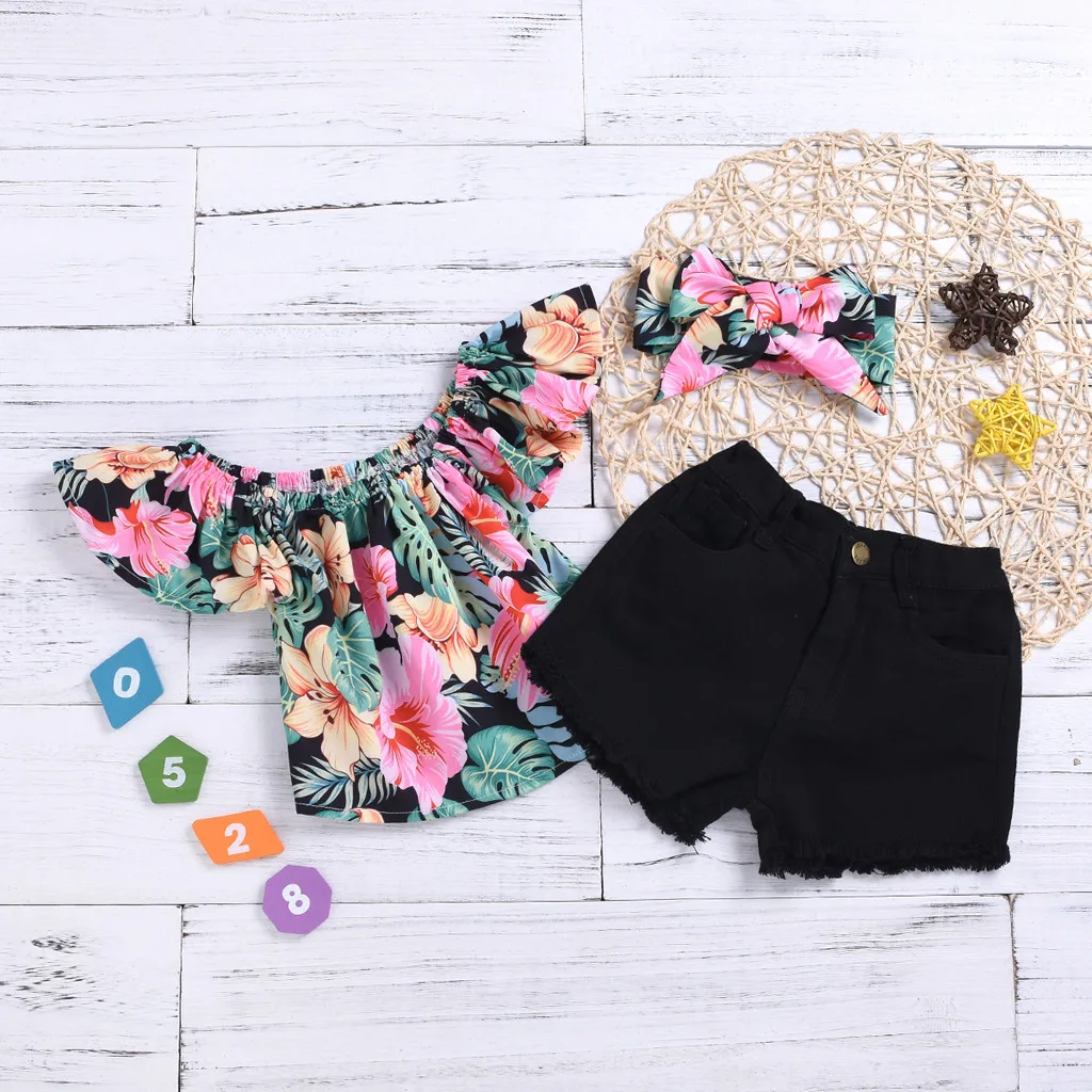 Детские топы с цветочным принтом и рукавами-крылышками для маленьких девочек; Комплект одежды с короткой лентой для волос