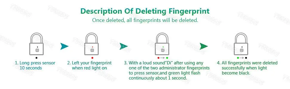 Когда отпечаток пальца не записан, любой отпечаток пальца можно разблокировать. Если отпечатки пальцев записаны, только записанные отпечатки пальцев можно использовать для разблокировки замка. Поэтому при нормальных обстоятельствах вы должны записывать более двух отпечатков пальцев, чтобы предотвратить неприятную ситуацию, когда пальцы поцарапаны и не могут быть разблокированы.