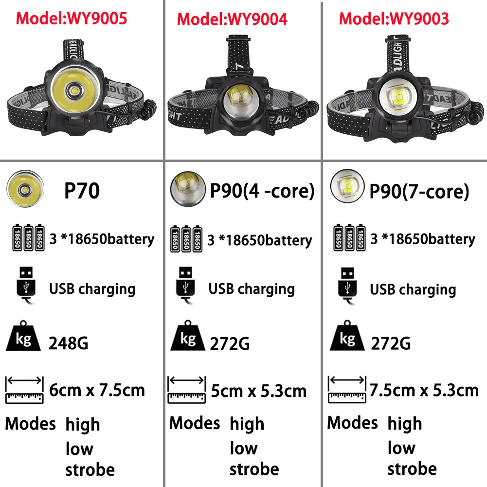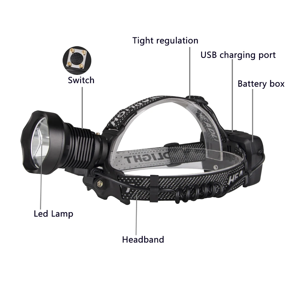 Особенности: Прочный корпус из алюминиевого сплава. Интеллектуальное управление схемой, телескопический зум, 3 режима (сильный, низкий, стробоскоп). Повязка на голову может растягиваться в соответствии с размером головы. Удобно надевать или снимать. Головка может регулировать угол освещения 90 градусов. Держатель аккумулятора имеет зарядный интерфейс, что делает зарядку более удобной. Также он имеет выходной порт USB, который может использоваться в качестве внешнего аккумулятора для экстренной зарядки. С отключением питания, чтобы помочь вам узнать количество энергии и зарядить в ближайшее время. Подходит для любителей спорта, таких как охота, езда на велосипеде, езда на велосипеде, альпинизм, поход, работа, рыбалка, кемпинг и т. д. Водонепроницаемый, поэтому, даже если он дождливый, вы можете использовать его нормально. Спецификация: Материал: алюминиевый сплав и АБС Цвет изделия: черный Светильник Цвет: белый Светодиодный излучатель: P90(7 ядер) Режим: 3 режима (высокий-низкий-Стробоскоп) Источник питания: 3*18650 батареи (не входят в комплект) Фонаря ламповый патрон Размер: 7,5 см x 5,3 см Вес: 272 г Посылка включает в себя: Налобный фонарь-1 шт.